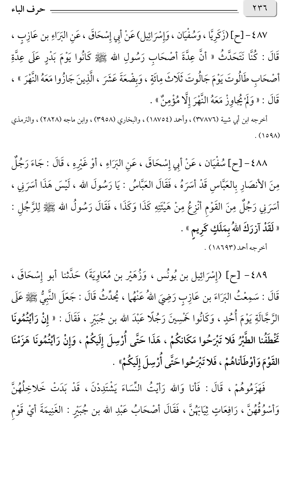 ٤٨٧ - [ح] (زَكَرِيَّا، وَسُفْيَان، وَإِسْرَائِيل) عَنْ أبِي إِسْحَاقَ، عَنِ البَرَاءِ بن عَازِبٍ، قَالَ: كُنَّا نَتَحَدَّثُ «أنَّ عِدَّةَ أصْحَابِ رَسُولِ الله صلى الله عليه وسلم كَانُوا يَوْمَ بَدْرٍ عَلَى عِدَّةِ أصْحَابِ طَالُوتَ يَوْمَ جَالُوتَ ثَلَاثَ مِائَةٍ، وَبِضْعَةَ عَشَرَ، الَّذِينَ جَازُوا مَعَهُ النَّهْرَ»، قَالَ: «وَلَمْ يُجاوِزْ مَعَهُ النَّهْرَ إِلَّا مُؤْمِنٌ».