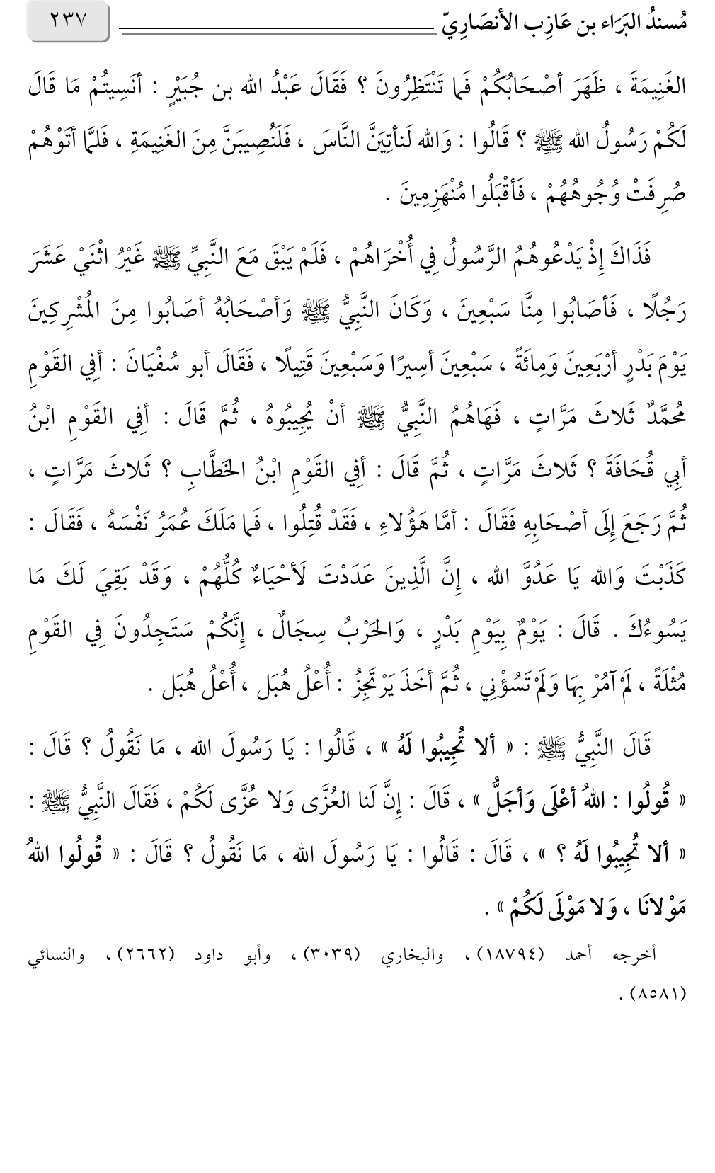 قَالَ النَّبِيُّ صلى الله عليه وسلم: «ألا تُجِيبُوا لَهُ»، قَالُوا: يَا رَسُولَ الله، مَا نَقُولُ؟ قَالَ: «قُولُوا: اللهُ أعْلَى وَأجَلُّ»، قَالَ: إِنَّ لَنا العُزَّى وَلا عُزَّى لَكُمْ، فَقَالَ النَّبِيُّ صلى الله عليه وسلم: «ألا تُجِيبُوا لَهُ؟ » قَالَ: قَالُوا: يَا رَسُولَ الله، مَا نَقُولُ؟ قَالَ، : «قُولُوا اللهُ مَوْلانَا، وَلا مَوْلَى لَكُمْ».