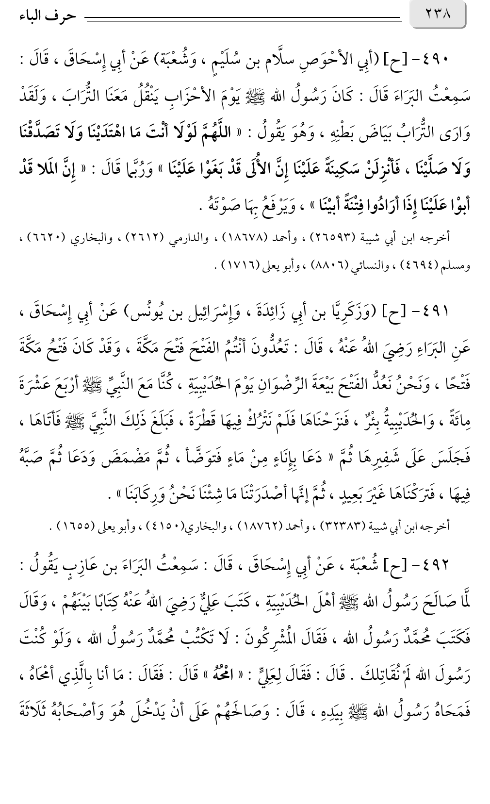 ٤٩١ - [ح] (وَزَكَرِيَّا بن أبِي زَائِدَةَ، وَإِسْرَائِيل بن يُونُس) عَنْ أبِي إِسْحَاقَ، عَنِ البَرَاءِ رَضِيَ اللهُ عَنْهُ، قَالَ: تَعُدُّونَ أنْتُمُ الفَتْحَ فَتْحَ مَكَّةَ، وَقَدْ كَانَ فَتْحُ مَكَّةَ فَتْحًا، وَنَحْنُ نَعُدُّ الفَتْحَ بَيْعَةَ الرِّضْوَانِ يَوْمَ الحُدَيْبِيَةِ، كُنَّا مَعَ النَّبِيِّ صلى الله عليه وسلم أرْبَعَ عَشْرَةَ مِائَةً، وَالحُدَيْبِيةُ بِئْرٌ، فَنزَحْنَاهَا فَلَمْ نَتْرُكْ فِيهَا قَطْرَةً، فَبَلَغَ ذَلِكَ النَّبِيَّ صلى الله عليه وسلم فَأتَاهَا، فَجَلَسَ عَلَى شَفِيرِهَا ثُمَّ «دَعَا بِإِنَاءٍ مِنْ مَاءٍ فَتوَضَّأ، ثُمَّ مَضْمَضَ وَدَعَا ثُمَّ صَبَّهُ فِيهَا، فَترَكْنَاهَا غَيْرَ بَعِيدٍ، ثُمَّ إنَّها أصْدَرَتْنَا مَا شِئْنَا نَحْنُ وَرِكَابَنَا».