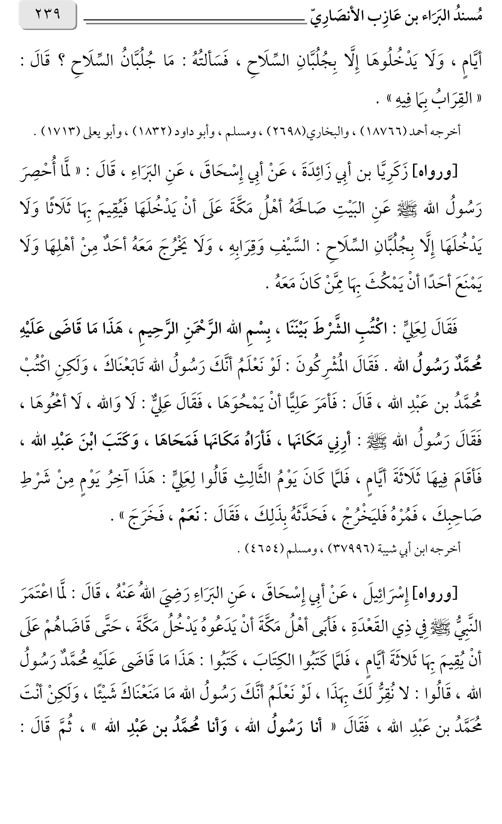 [ورواه] زَكَرِيَّا بن أبِي زَائِدَةَ، عَنْ أبِي إِسْحَاقَ، عَنِ البَرَاءِ، قَالَ: «لمَّا أُحْصِرَ رَسُولُ الله صلى الله عليه وسلم عَنِ البَيْتِ صَالحَهُ أهْلُ مَكَّةَ عَلَى أنْ يَدْخُلَهَا فَيُقِيمَ بِهَا ثَلَاثًا وَلَا يَدْخُلَهَا إِلَّا بِجُلُبَّانِ السِّلَاحِ: السَّيْفِ وَقِرَابِهِ، وَلَا يَخْرُجَ مَعَهُ أحَدٌ مِنْ أهْلِهَا وَلَا يَمْنَعَ أحَدًا أنْ يَمْكُثَ بِهَا مِمَّنْ كَانَ مَعَهُ.