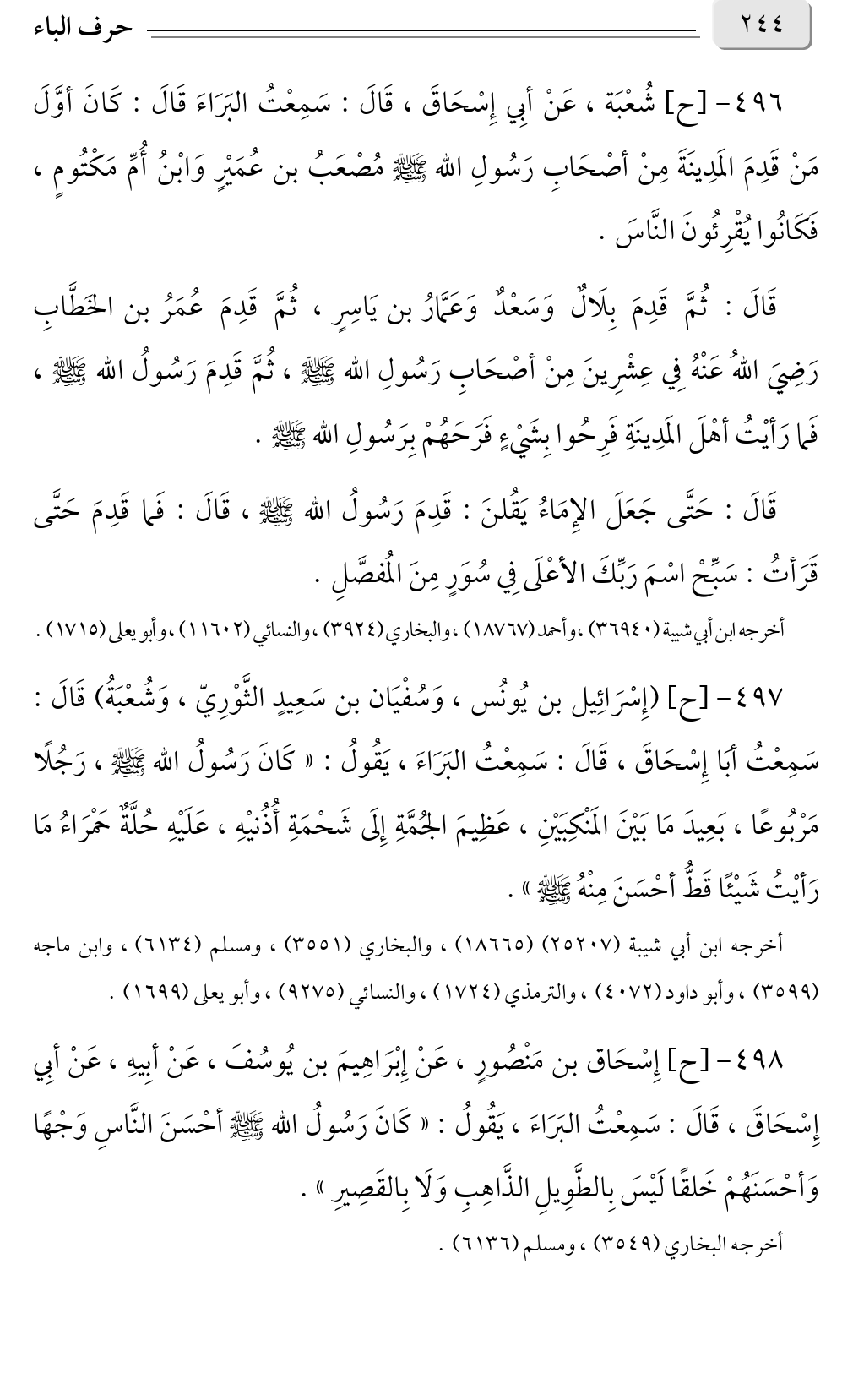 ٤٩٨ - [ح] إِسْحَاق بن مَنْصُورٍ، عَنْ إِبْرَاهِيمَ بن يُوسُفَ، عَنْ أبِيهِ، عَنْ أبِي إِسْحَاقَ، قَالَ: سَمِعْتُ البَرَاءَ، يَقُولُ: «كَانَ رَسُولُ الله صلى الله عليه وسلم أحْسَنَ النَّاسِ وَجْهًا وَأحْسَنَهُمْ خَلقًا لَيْسَ بِالطَّوِيلِ الذَّاهِبِ وَلَا بِالقَصِيرِ».