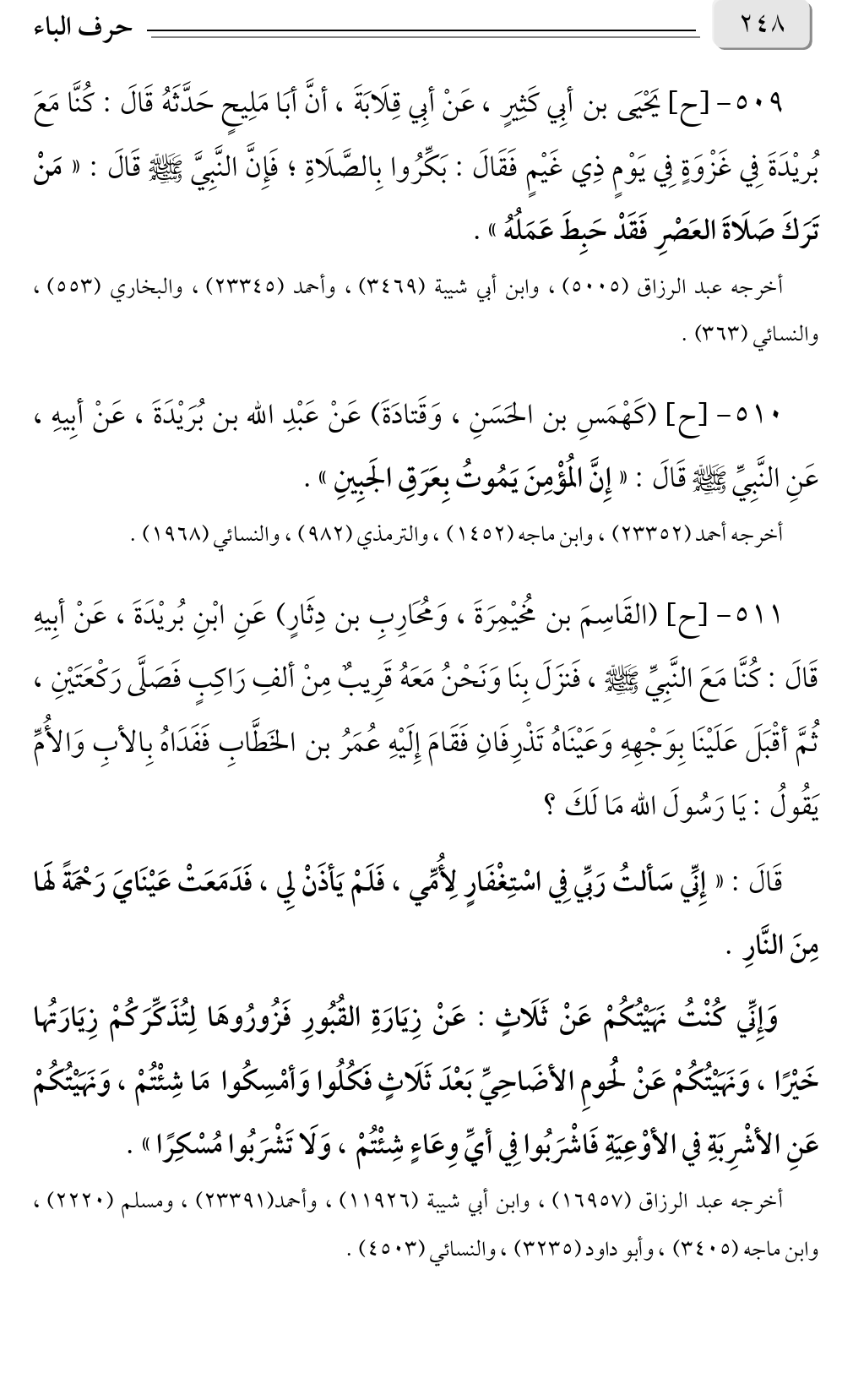 ٥٠٩ - [ح] يَحْيَى بن أبِي كَثِيرٍ، عَنْ أبِي قِلَابَةَ، أنَّ أبَا مَلِيحٍ حَدَّثَهُ قَالَ: كُنَّا مَعَ بُريْدَةَ فِي غَزْوَةٍ فِي يَوْمٍ ذِي غَيْمٍ فَقَالَ: بَكِّرُوا بِالصَّلَاةِ؛ فَإِنَّ النَّبِيَّ صلى الله عليه وسلم قَالَ: «مَنْ تَرَكَ صَلَاةَ العَصْرِ فَقَدْ حَبِطَ عَمَلُهُ».