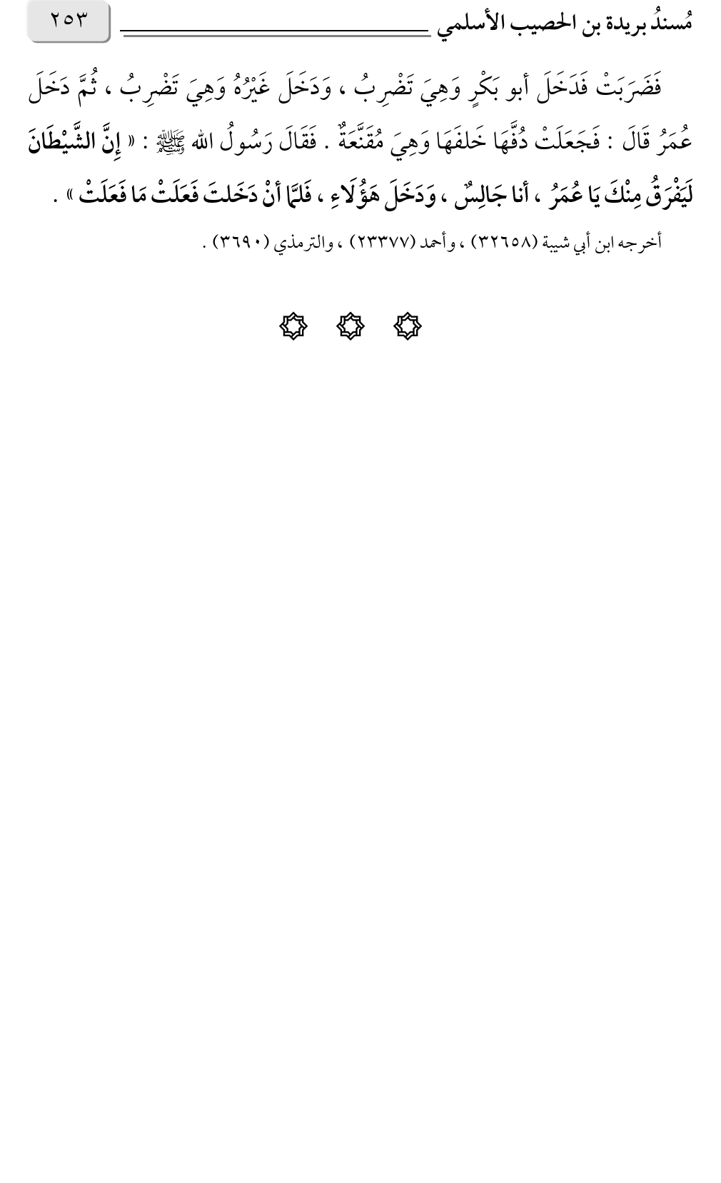 فَضَرَبَتْ فَدَخَلَ أبو بَكْرٍ وَهِيَ تَضْرِبُ، وَدَخَلَ غَيْرُهُ وَهِيَ تَضْرِبُ، ثُمَّ دَخَلَ عُمَرُ قَالَ: فَجَعَلَتْ دُفَّهَا خَلفَهَا وَهِيَ مُقَنَّعَةٌ. فَقَالَ رَسُولُ الله صلى الله عليه وسلم: «إِنَّ الشَّيْطَانَ لَيَفْرَقُ مِنْكَ يَا عُمَرُ، أنا جَالِسٌ، وَدَخَلَ هَؤُلَاءِ، فَلمَّا أنْ دَخَلتَ فَعَلَتْ مَا فَعَلَتْ».