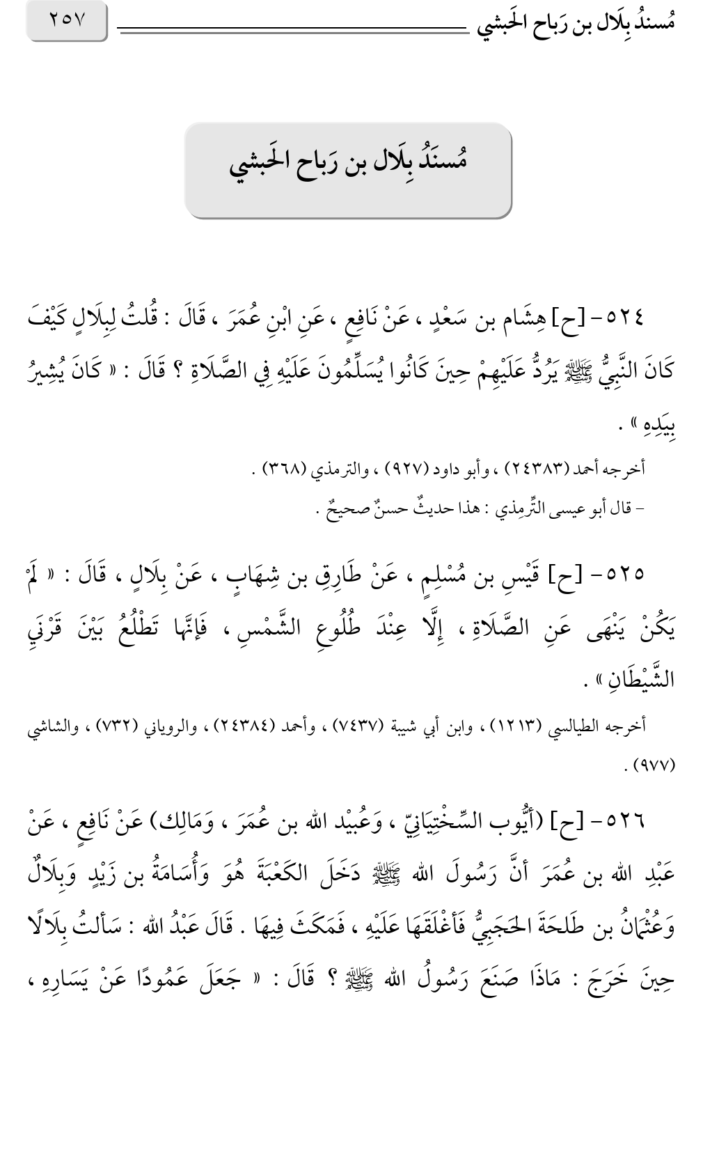 ٥٢٤ - [ح] هِشَام بن سَعْدٍ، عَنْ نَافِعٍ، عَنِ ابْنِ عُمَرَ، قَالَ: قُلتُ لِبِلَالٍ كَيْفَ كَانَ النَّبِيُّ صلى الله عليه وسلم يَرُدُّ عَلَيْهِمْ حِينَ كَانُوا يُسَلِّمُونَ عَلَيْهِ فِي الصَّلَاةِ؟ قَالَ: «كَانَ يُشِيرُ بِيَدِهِ».