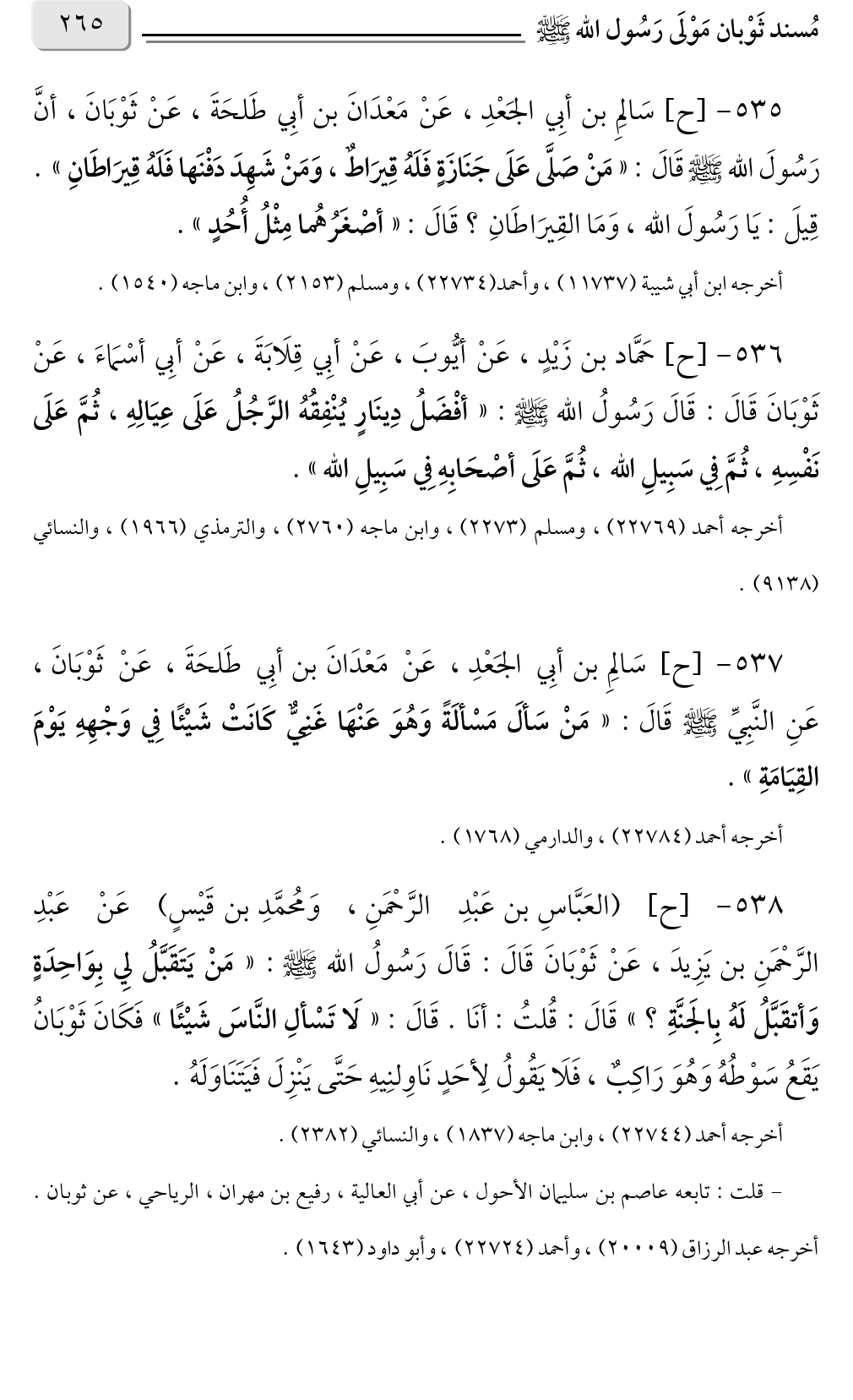 ٥٣٨ - [ح] (العَبَّاسِ بن عَبْدِ الرَّحْمَنِ، وَمُحمَّدِ بن قَيْسٍ) عَنْ عَبْدِ الرَّحْمَنِ بن يَزِيدَ، عَنْ ثَوْبَانَ قَالَ: قَالَ رَسُولُ الله صلى الله عليه وسلم: «مَنْ يَتَقَبَّلُ لِي بِوَاحِدَةٍ؟ وَأتقَبَّلُ لَهُ بِالجَنَّةِ» قَالَ: قُلتُ: أنَا. قَالَ: «لَا تَسْألِ النَّاسَ شَيْئًا» فَكَانَ ثَوْبَانُ يَقَعُ سَوْطُهُ وَهُوَ رَاكِبٌ، فَلَا يَقُولُ لِأحَدٍ نَاوِلنِيهِ حَتَّى يَنْزِلَ فَيَتَنَاوَلَهُ.
