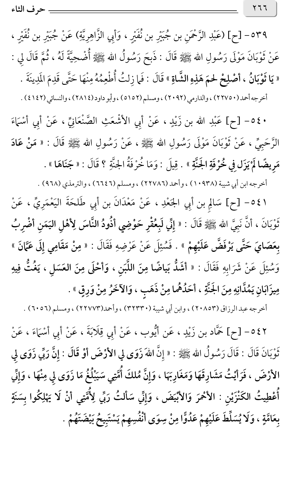 ٥٣٩ - [ح] (عَبْدِ الرَّحْمَنِ بن جُبَيْرِ بن نُفَيْرٍ، وَأبِي الزَّاهِرِيَّةِ) عَنْ جُبَيْرِ بن نُفَيْرٍ، عَنْ ثَوْبَانَ مَوْلَى رَسُولِ الله صلى الله عليه وسلم قَالَ: ذَبحَ رَسُولُ الله صلى الله عليه وسلم أُضْحِيَّةً لَهُ، ثُمَّ قَالَ لِي: «يَا ثَوْبَانُ، أصْلِحْ لحمَ هَذِهِ الشَّاةِ» قَالَ: فَما زِلتُ أُطْعِمُهُ مِنْهَا حَتَّى قَدِمَ المَدِينَةَ.