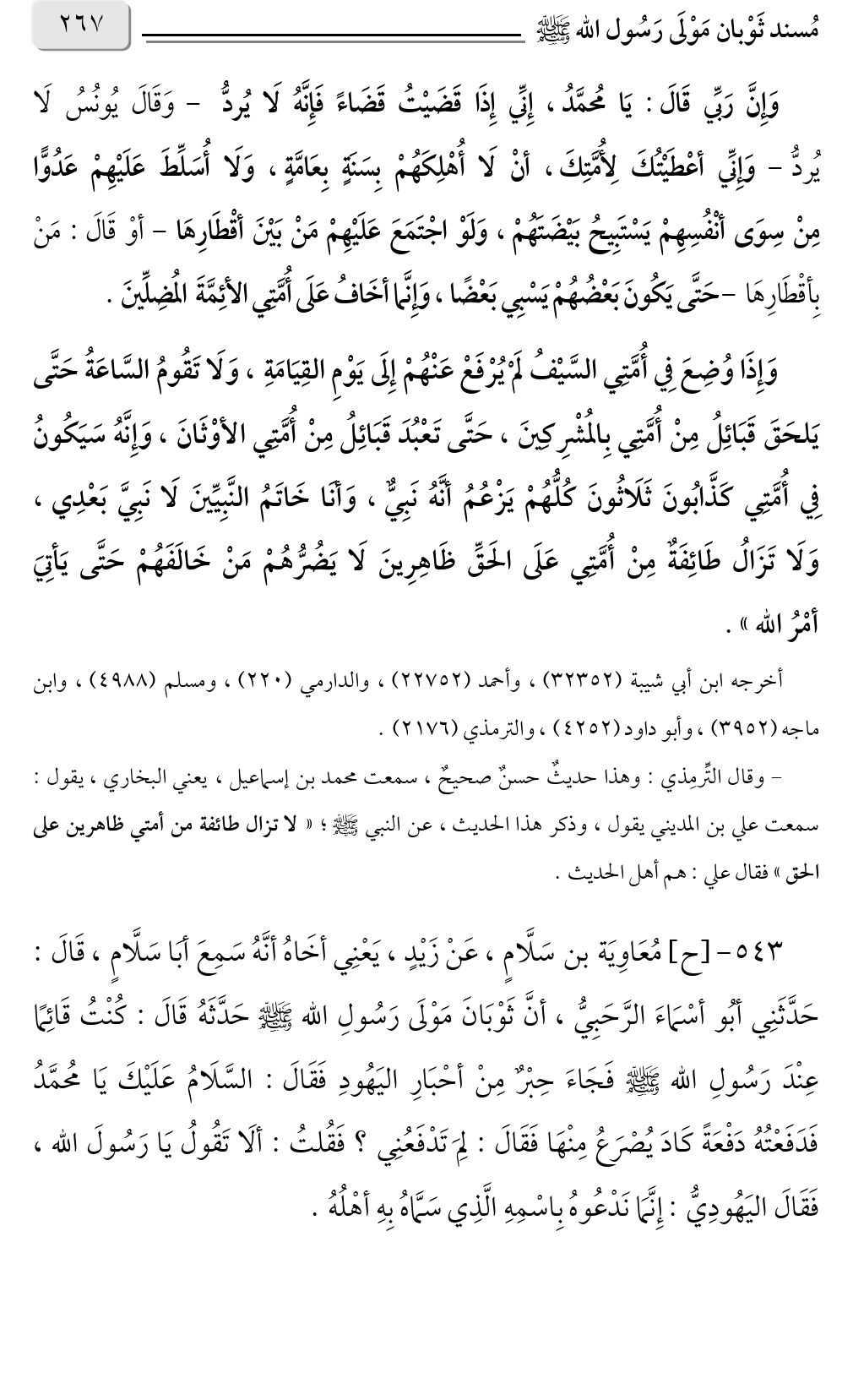 ٥٤٣ - [ح] مُعَاوِيَة بن سَلَّامٍ، عَنْ زَيْدٍ، يَعْنِي أخَاهُ أنَّهُ سَمِعَ أبَا سَلَّامٍ، قَالَ: حَدَّثَنِي أبُو أسْمَاءَ الرَّحَبِيُّ، أنَّ ثَوْبَانَ مَوْلَى رَسُولِ الله صلى الله عليه وسلم حَدَّثَهُ قَالَ: كُنْتُ قَائِمًا عِنْدَ رَسُولِ الله صلى الله عليه وسلم فَجَاءَ حِبْرٌ مِنْ أحْبَارِ اليَهُودِ فَقَالَ: السَّلَامُ عَلَيْكَ يَا مُحمَّدُ فَدَفَعْتُهُ دَفْعَةً كَادَ يُصْرَعُ مِنْهَا فَقَالَ: لِمَ تَدْفَعُنِي؟ فَقُلتُ: ألَا تَقُولُ يَا رَسُولَ الله، فَقَالَ اليَهُودِيُّ: إِنَّمَا نَدْعُوهُ بِاسْمِهِ الَّذِي سَمَّاهُ بِهِ أهْلُهُ.