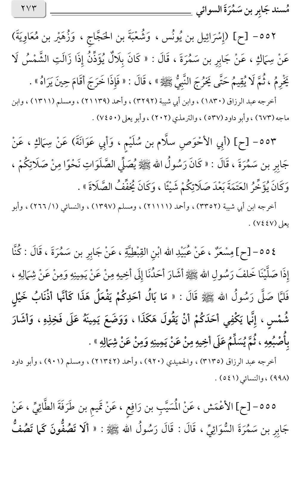 ٥٥٥ - [ح] الأعْمَش، عَنْ المُسَيَّبِ بن رَافِعٍ، عَنْ تَميمِ بن طَرَفَةَ الطَّائِيِّ، عَنْ جَابِرِ بن سَمُرَةَ السُّوَائِيِّ، قَالَ: قَالَ رَسُولُ الله صلى الله عليه وسلم: «ألَا تَصُفُّونَ كَما تَصُفُّ