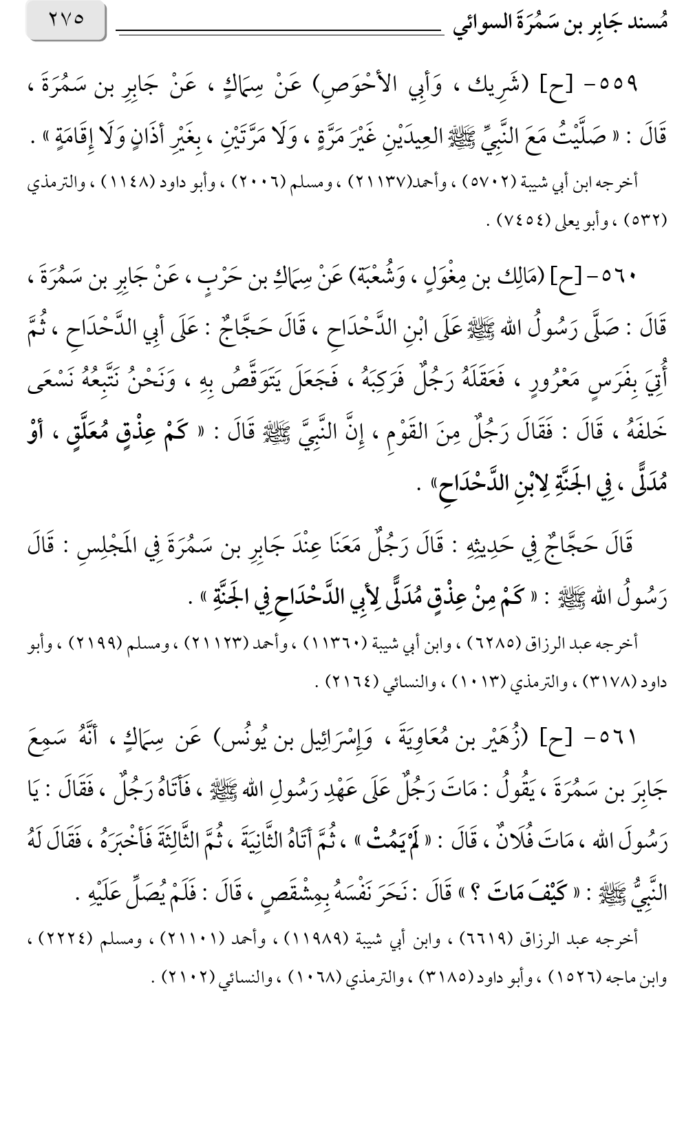 ٥٦٠ - [ح] (مَالِك بن مِغْوَلٍ، وَشُعْبَة) عَنْ سِمَاكِ بن حَرْبٍ، عَنْ جَابِرِ بن سَمُرَةَ، قَالَ: صَلَّى رَسُولُ الله صلى الله عليه وسلم عَلَى ابْنِ الدَّحْدَاحِ، قَالَ حَجَّاجٌ: عَلَى أبِي الدَّحْدَاحِ، ثُمَّ أُتِيَ بِفَرَسٍ مَعْرُورٍ، فَعَقَلَهُ رَجُلٌ فَرَكِبَهُ، فَجَعَلَ يَتَوَقَّصُ بِهِ، وَنَحْنُ نَتَّبِعُهُ نَسْعَى خَلفَهُ، قَالَ: فَقَالَ رَجُلٌ مِنَ القَوْمِ، إِنَّ النَّبِيَّ صلى الله عليه وسلم قَالَ: «كَمْ عِذْقٍ مُعَلَّقٍ، أوْ مُدَلًّى، فِي الجَنَّةِ لِابْنِ الدَّحْدَاحِ».