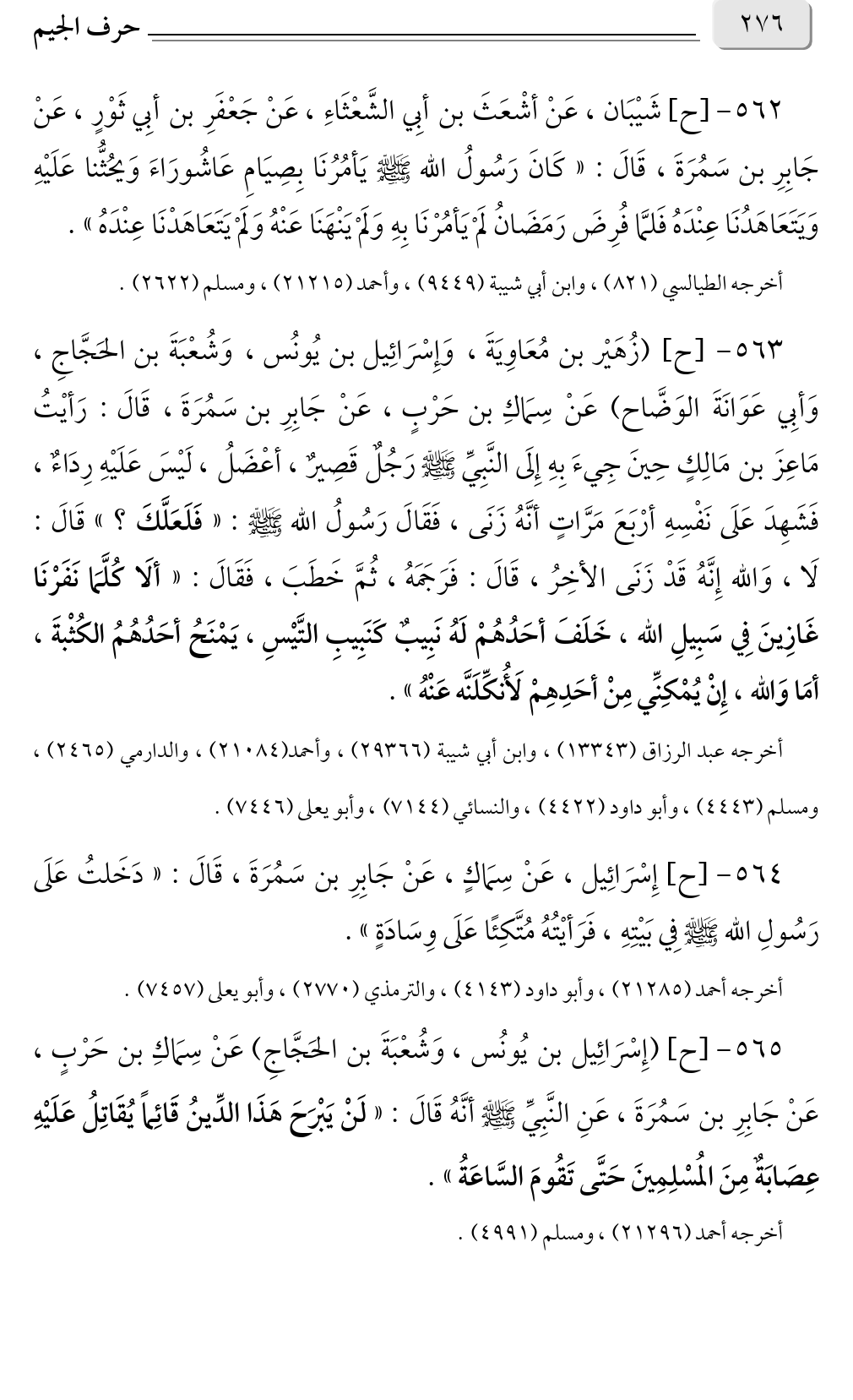 ٥٦٥ - [ح] (إِسْرَائِيل بن يُونُس، وَشُعْبَةَ بن الحَجَّاجِ) عَنْ سِمَاكِ بن حَرْبٍ، عَنْ جَابِرِ بن سَمُرَةَ، عَنِ النَّبِيِّ صلى الله عليه وسلم أنَّهُ قَالَ: «لَنْ يَبْرَحَ هَذَا الدِّينُ قَائِمًا يُقَاتِلُ عَلَيْهِ عِصَابَةٌ مِنَ المُسْلِمِينَ حَتَّى تَقُومَ السَّاعَةُ».
