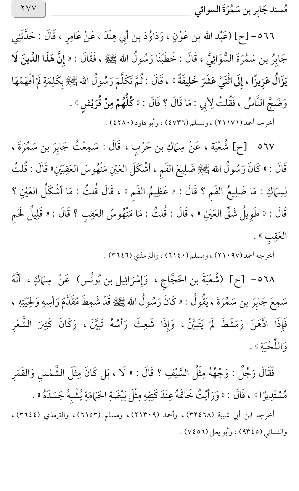 ٥٦٦ - [ح] (عَبْد الله بن عَوْنٍ، وَدَاوُدَ بن أبِي هِنْدَ، عَنْ عَامِرٍ، قَالَ: حَدَّثَنِي جَابِرُ بن سَمُرَةَ السُّوَائِيُّ، قَالَ: خَطَبَنَا رَسُولُ الله صلى الله عليه وسلم، فَقَالَ: «إِنَّ هَذَا الدِّينَ لَا يَزَالُ عَزِيزًا، إِلَى اثْنَيْ عَشَرَ خَلِيفَةً» قَالَ: ثُمَّ تَكَلَّمَ رَسُولُ الله صلى الله عليه وسلم بِكَلِمَةٍ لَمْ أفْهَمْهَا، وَضَجَّ النَّاسُ، فَقُلتُ لِأبِي: مَا قَالَ؟ قَالَ: «كُلُّهُمْ مِنْ قُرَيْشٍ».