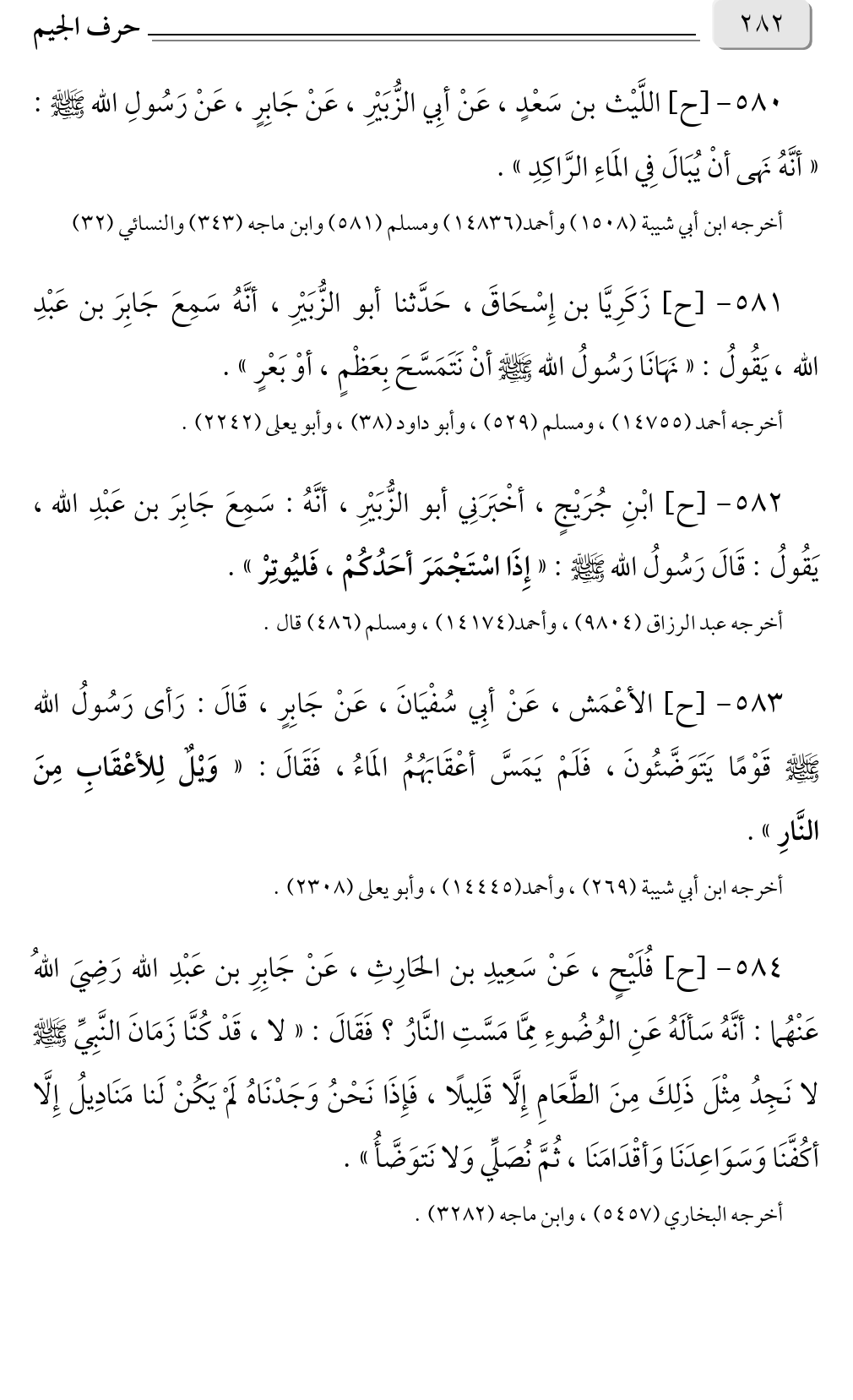 ٥٨١ - [ح] زَكَرِيَّا بن إِسْحَاقَ، حَدَّثنا أبو الزُّبَيْرِ، أنَّهُ سَمِعَ جَابِرَ بن عَبْدِ الله، يَقُولُ: «نَهَانَا رَسُولُ الله صلى الله عليه وسلم أنْ نَتَمَسَّحَ بِعَظْمٍ، أوْ بَعْرٍ».