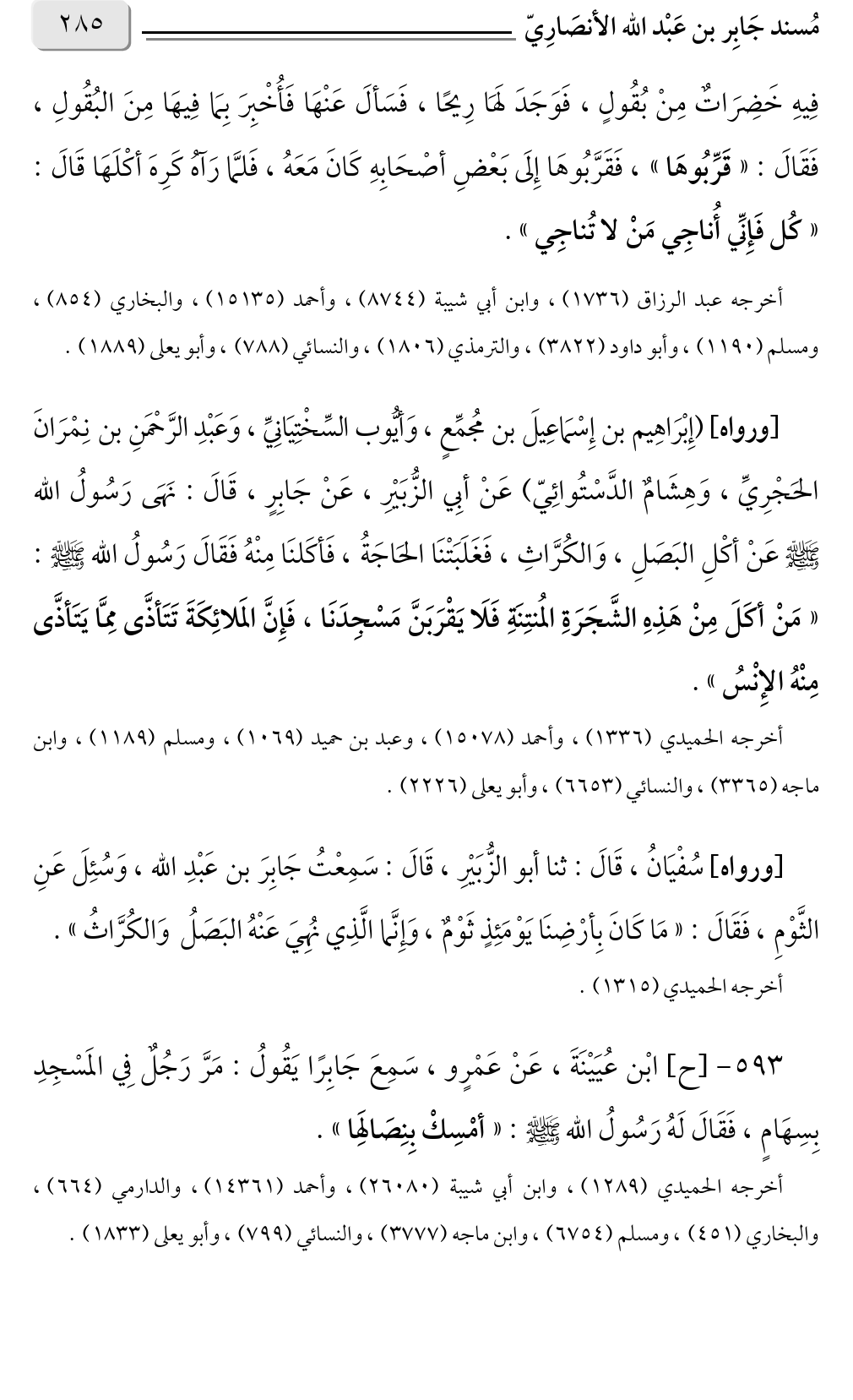 [ورواه] (إِبْرَاهِيم بن إِسْمَاعِيلَ بن مُجمِّعٍ، وَأيُّوب السِّخْتِيَانِيِّ، وَعَبْدِ الرَّحْمَنِ بن نِمْرَانَ الحَجْرِيِّ، وَهِشَامٌ الدَّسْتُوائِيّ) عَنْ أبِي الزُّبَيْرِ، عَنْ جَابِرٍ، قَالَ: نَهَى رَسُولُ الله صلى الله عليه وسلم عَنْ أكْلِ البَصَلِ، وَالكُرَّاثِ، فَغَلَبَتْنَا الحَاجَةُ، فَأكَلنَا مِنْهُ فَقَالَ رَسُولُ الله صلى الله عليه وسلم: «مَنْ أكَلَ مِنْ هَذِهِ الشَّجَرَةِ المُنتِنَةِ فَلَا يَقْرَبَنَّ مَسْجِدَنَا، فَإِنَّ المَلائِكَةَ تَتَأذَّى مِمَّا يَتَأذَّى مِنْهُ الإِنْسُ».
