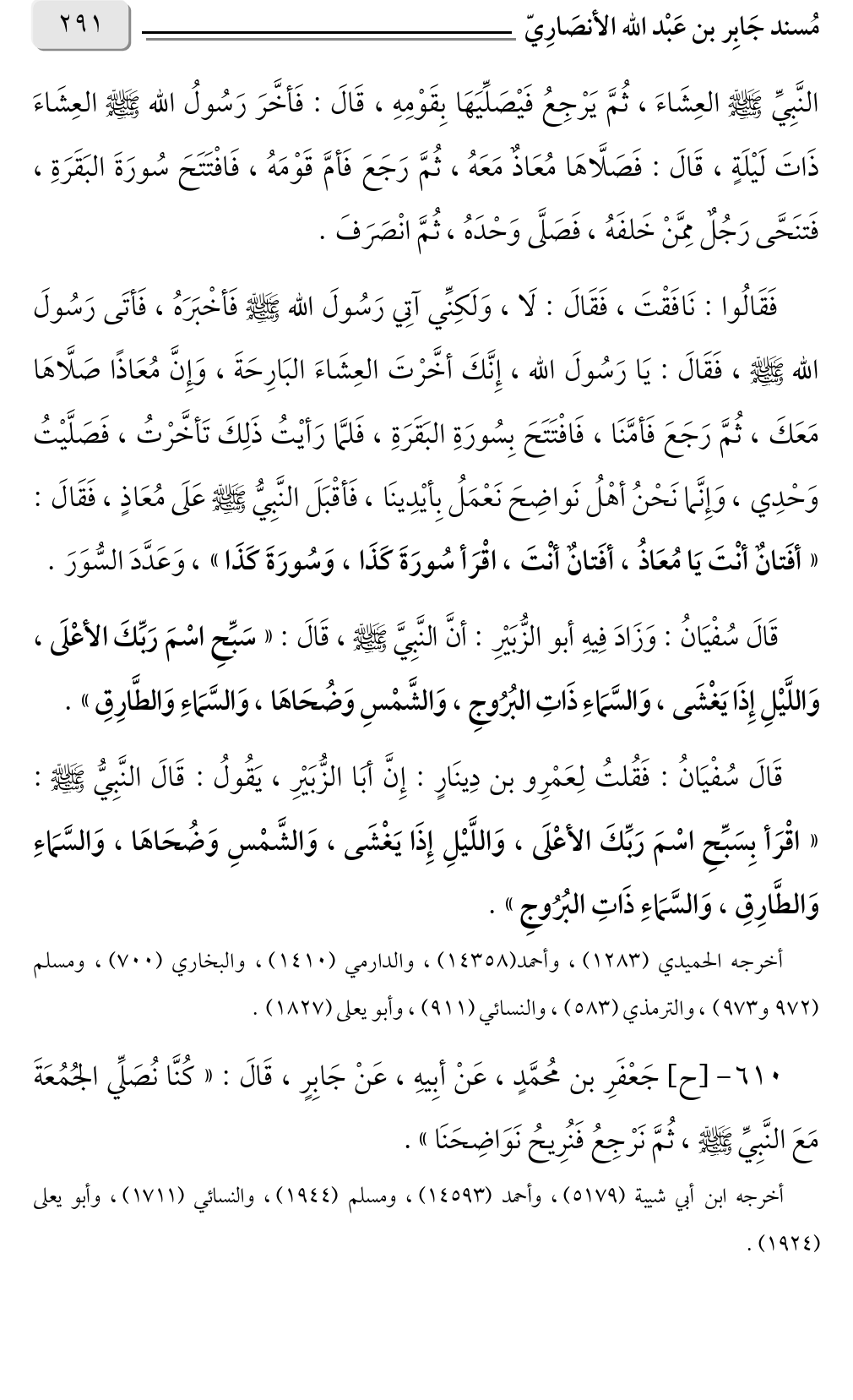 ٦١٠ - [ح] جَعْفَرِ بن مُحمَّدٍ، عَنْ أبِيهِ، عَنْ جَابِرٍ، قَالَ: «كُنَّا نُصَلِّي الجُمُعَةَ مَعَ النَّبِيِّ صلى الله عليه وسلم، ثُمَّ نَرْجِعُ فَنُرِيحُ نَوَاضِحَنَا».