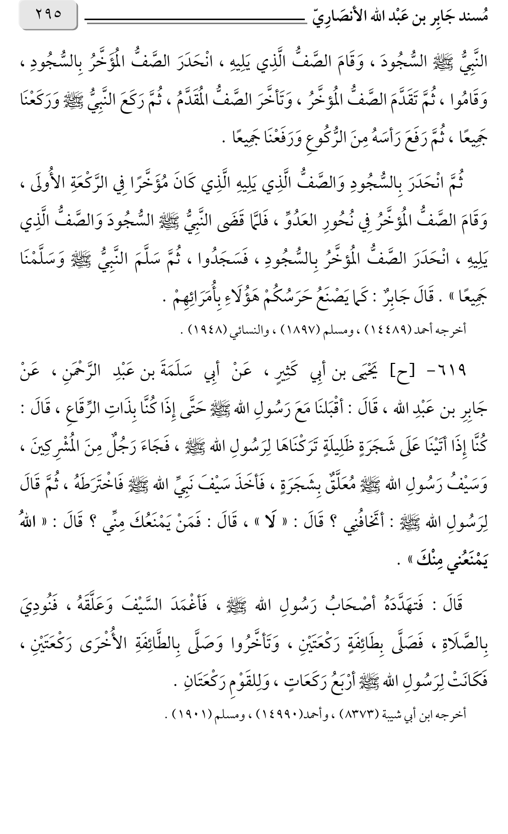 ثُمَّ انْحَدَرَ بِالسُّجُودِ وَالصَّفُّ الَّذِي يَلِيهِ الَّذِي كَانَ مُؤَخَّرًا فِي الرَّكْعَةِ الأُولَى، وَقَامَ الصَّفُّ المُؤخَّرُ فِي نُحُورِ العَدُوِّ، فَلمَّا قَضَى النَّبِيُّ صلى الله عليه وسلم السُّجُودَ وَالصَّفُّ الَّذِي يَلِيهِ، انْحَدَرَ الصَّفُّ المُؤخَّرُ بِالسُّجُودِ، فَسَجَدُوا، ثُمَّ سَلَّمَ النَّبِيُّ صلى الله عليه وسلم وَسَلَّمْنَا جَمِيعًا» قَالَ جَابِرٌ: كَما يَصْنَعُ حَرَسُكُمْ هَؤُلَاءِ بِأُمَرَائِهِمْ. .