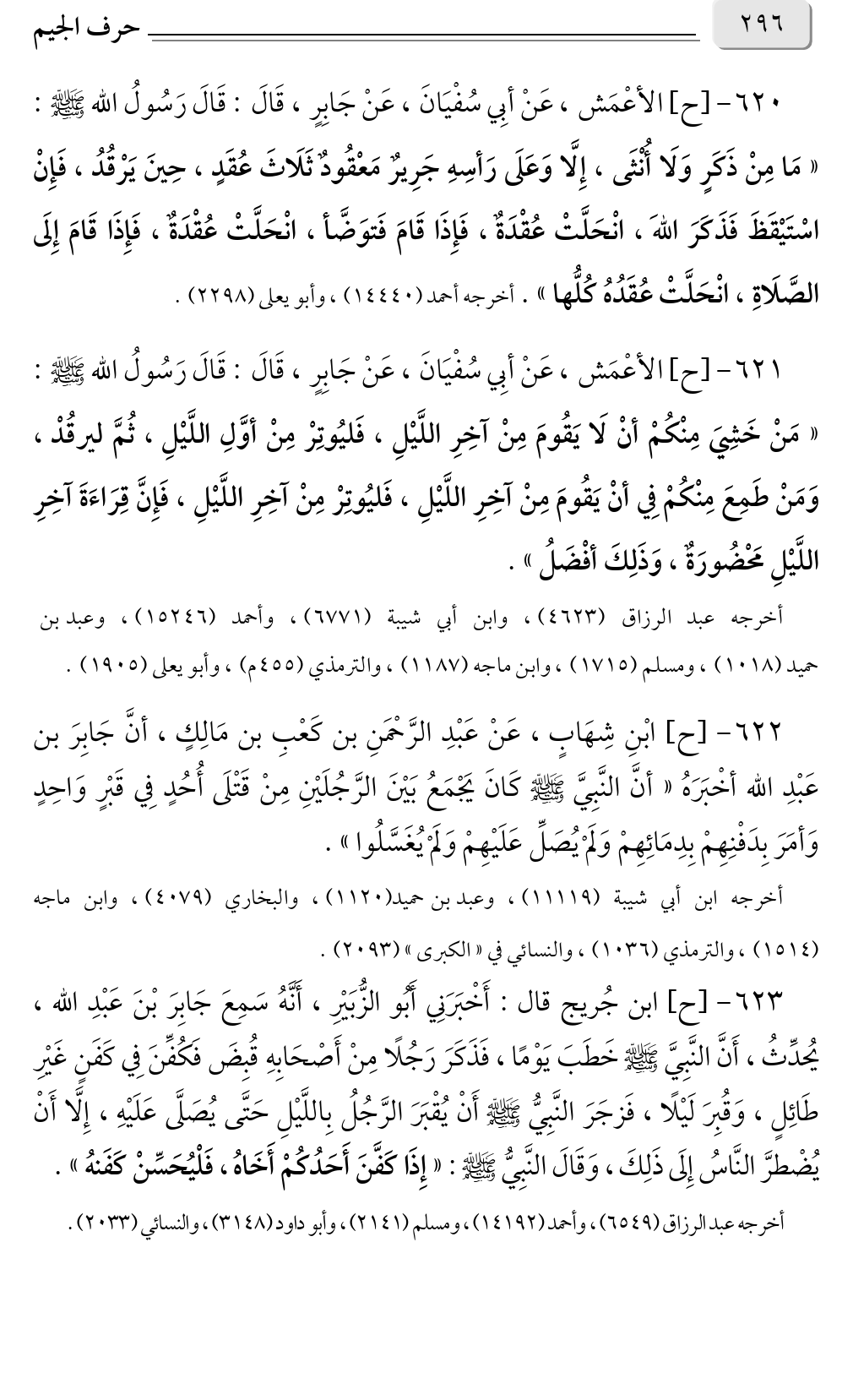 ٦٢٠ - [ح] الأعْمَش، عَنْ أبِي سُفْيَانَ، عَنْ جَابِرٍ، قَالَ: قَالَ رَسُولُ الله صلى الله عليه وسلم: «مَا مِنْ ذَكَرٍ وَلَا أُنْثَى، إِلَّا وَعَلَى رَأسِهِ جَرِيرٌ مَعْقُودٌ ثَلَاثَ عُقَدٍ، حِينَ يَرْقُدُ، فَإِنْ اسْتَيْقَظَ فَذَكَرَ اللهَ، انْحَلَّتْ عُقْدَةٌ، فَإِذَا قَامَ فَتوَضَّأ، انْحَلَّتْ عُقْدَةٌ، فَإِذَا قَامَ إِلَى الصَّلَاةِ، انْحَلَّتْ عُقَدُهُ كُلُّها».