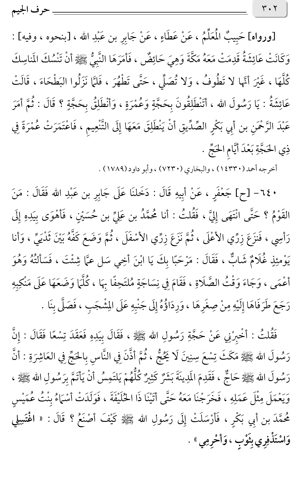 ٦٤٠ - [ح] جَعْفَرٍ، عَنْ أبِيهِ قَالَ: دَخَلنَا عَلَى جَابِرِ بن عَبْدِ الله فَقَالَ: مَنَ القَوْمُ؟ حَتَّى انْتَهَى إِليَّ، فَقُلتُ: أنا مُحمَّدُ بن عَلِيِّ بن حُسَيْنٍ، فَأهْوَى بِيَدِهِ إِلَى رَأسِي، فَنزَعَ زِرِّي الأعْلَى، ثُمَّ نَزَعَ زِرِّي الأسْفَلَ، ثُمَّ وَضَعَ كَفَّهُ بَيْنَ ثَدْيَيِّ، وَأنا يَوْمئِذٍ غُلَامٌ شَابٌّ، فَقَالَ: مَرْحَبًا بِكَ يَا ابْنَ أخِي سَل عمَّا شِئْتَ، فَسَألتُهُ وَهُوَ أعْمَى، وَجَاءَ وَقْتُ الصَّلَاةِ، فَقَامَ فِي نِسَاجَةٍ مُلتَحِفًا بِهَا، كُلَّمَا وَضَعَهَا عَلَى مَنْكِبِهِ رَجَعَ طَرَفَاهَا إِلَيْهِ مِنْ صِغَرِهَا، وَرِدَاؤُهُ إِلَى جَنْبِهِ عَلَى المِشْجَبِ، فَصَلَّى بِنَا. فَقُلتُ: أخْبِرْنِي عَنْ حَجَّةِ رَسُولِ الله صلى الله عليه وسلم، فَقَالَ بِيَدِهِ فَعَقَدَ تِسْعًا فَقَالَ: إِنَّ رَسُولَ الله صلى الله عليه وسلم مَكَثَ تِسْعَ سِنِينَ لَا يَحُجُّ، ثُمَّ أذَّنَ فِي النَّاسِ بِالحَجِّ فِي العَاشِرَةِ: أنَّ رَسُولَ الله صلى الله عليه وسلم حَاجٌّ، فَقَدِمَ المَدِينَةَ بَشَرٌ كَثِيرٌ كُلُّهُمْ يَلتَمِسُ أنْ يَأتَمَّ بِرَسُولِ الله صلى الله عليه وسلم، وَيَعْمَلَ مِثْلَ عَمَلِهِ، فَخَرَجْنَا مَعَهُ حَتَّى أتَيْنَا ذَا الحُلَيْفَةَ، فَوَلَدَتْ أسْمَاءُ بِنْتُ عُمَيْسٍ مُحمَّدَ بن أبِي بَكْرٍ، فَأرْسَلَتْ إِلَى رَسُولِ الله صلى الله عليه وسلم كَيْفَ أصْنَعُ؟ قَالَ: «اغْتَسِلِي وَاسْتَذْفِرِي بِثَوْبٍ، وَأحْرِمِي».