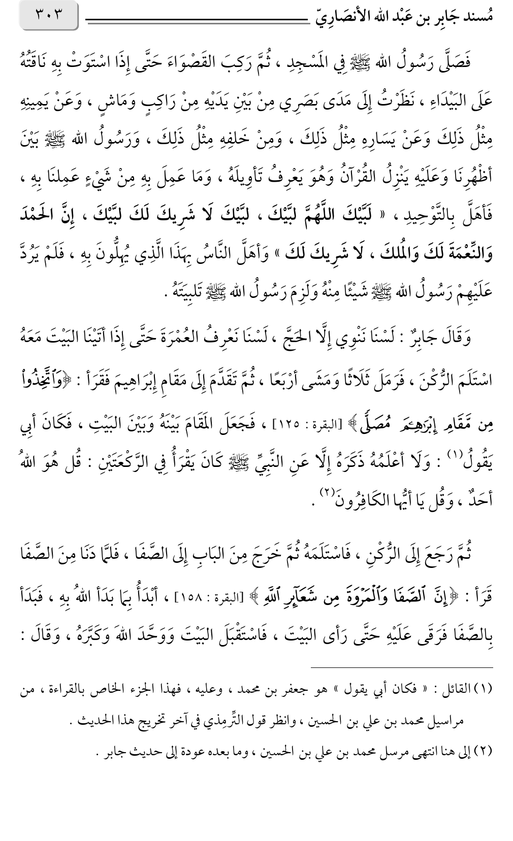 فَصَلَّى رَسُولُ الله صلى الله عليه وسلم فِي المَسْجِدِ، ثُمَّ رَكِبَ القَصْوَاءَ حَتَّى إِذَا اسْتَوَتْ بِهِ نَاقَتُهُ عَلَى البَيْدَاءِ، نَظَرْتُ إِلَى مَدَى بَصَرِي مِنْ بَيْنِ يَدَيْهِ مِنْ رَاكِبٍ وَمَاشٍ، وَعَنْ يَمِينِهِ مِثْلُ ذَلِكَ وَعَنْ يَسَارِهِ مِثْلُ ذَلِكَ، وَمِنْ خَلفِهِ مِثْلُ ذَلِكَ، وَرَسُولُ الله صلى الله عليه وسلم بَيْنَ أظْهُرِنَا وَعَلَيْهِ يَنْزِلُ القُرْآنُ وَهُوَ يَعْرِفُ تَأوِيلَهُ، وَمَا عَمِلَ بِهِ مِنْ شَيْءٍ عَمِلنَا بِهِ، ، فَأهَلَّ بِالتَّوْحِيدِ «لَبَّيْكَ اللَّهُمَّ لبَّيْكَ، لبَّيْكَ لَا شَرِيكَ لَكَ لبَّيْكَ، إِنَّ الحَمْدَ وَالنِّعْمَةَ لَكَ وَالمُلكَ، لَا شَرِيكَ لَكَ» وَأهَلَّ النَّاسُ بِهَذَا الَّذِي يُهِلُّونَ بِهِ، فَلَمْ يَرُدَّ عَلَيْهِمْ رَسُولُ الله صلى الله عليه وسلم شَيْئًا مِنْهُ وَلَزِمَ رَسُولُ الله صلى الله عليه وسلم تَلبِيَتَهُ.