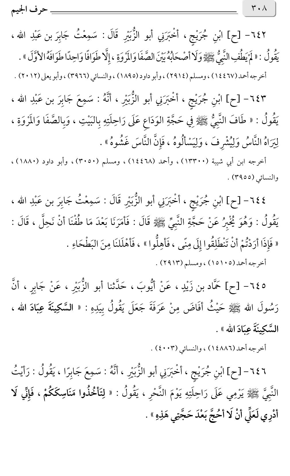 ٦٤٥ - [ح] حَمَّاد بن زَيْدٍ، عَنْ أيُّوبَ، حَدَّثنا أبو الزُّبَيْرِ، عَنْ جَابِرٍ، أنَّ رَسُولَ الله صلى الله عليه وسلم حَيْثُ أفَاضَ مِنْ عَرَفَةَ جَعَلَ يَقُولُ بِيَدِهِ: «السَّكِينَةَ عِبَادَ الله، السَّكِينَةَ عِبَادَ الله».