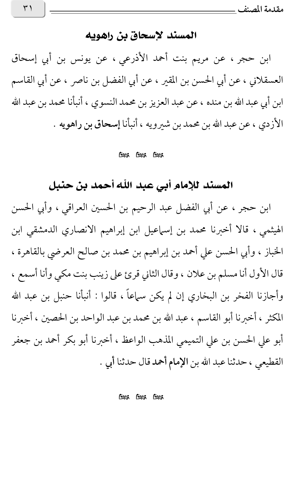 ابن حجر، عن أبي الفضل عبد الرحيم بن الحسين العراقي، وأبي الحسن الهيثمي، قالا أخبرنا محمد بن إسماعيل ابن إبراهيم الانصاري الدمشقي ابن الخباز، وأبي الحسن علي أحمد بن إبراهيم بن محمد بن صالح العرضي بالقاهرة، قال الأول أنا مسلم بن علان، وقال الثاني قرئ على زينب بنت مكي وأنا أسمع، وأجازنا الفخر بن البخاري إن لم يكن سماعًا، قالوا: أنبأنا حنبل بن عبد الله المكثر، أخبرنا أبو القاسم، عبد الله بن محمد بن عبد الواحد بن الحصين، أخبرنا أبو علي الحسن بن علي التميمي المذهب الواعظ، أخبرنا أبو بكر أحمد بن جعفر القطيعي، حدثنا عبد الله بن الإمام أحمد قال حدثنا أبي.