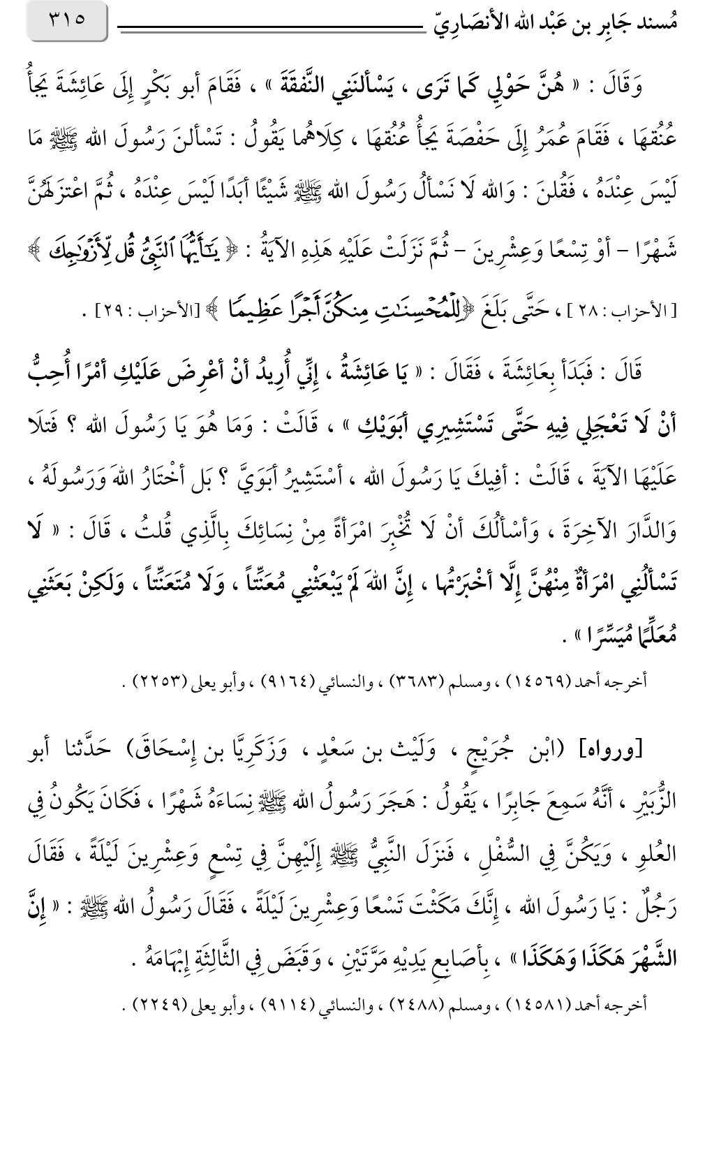 وَقَالَ: «هُنَّ حَوْلِي كَما تَرَى، يَسْألنَنِي النَّفقَةَ» فَقَامَ أبو بَكْرٍ إِلَى عَائِشَةَ يَجأُ، عُنُقهَا، فَقَامَ عُمَرُ إِلَى حَفْصَةَ يَجأُ عُنُقهَا، كِلَاهُما يَقُولُ: تَسْألنَ رَسُولَ الله صلى الله عليه وسلم مَا لَيْسَ عِنْدَهُ، فَقُلنَ: وَالله لَا نَسْألُ رَسُولَ الله صلى الله عليه وسلم شَيْئًا أبَدًا لَيْسَ عِنْدَهُ، ثُمَّ اعْتزَلَهُنَّ شَهْرًا - أوْ تِسْعًا وَعِشْرِينَ - ثُمَّ نَزَلَتْ عَلَيْهِ هَذِهِ الآيَةُ: {يَاأَيُّهَا النَّبِيُّ قُلْ لِأَزْوَاجِكَ} [الأحزاب: ٢٨]، حَتَّى بَلَغَ {لِلْمُحْسِنَاتِ مِنْكُنَّ أَجْرًا عَظِيمًا} [الأحزاب: ٢٩].