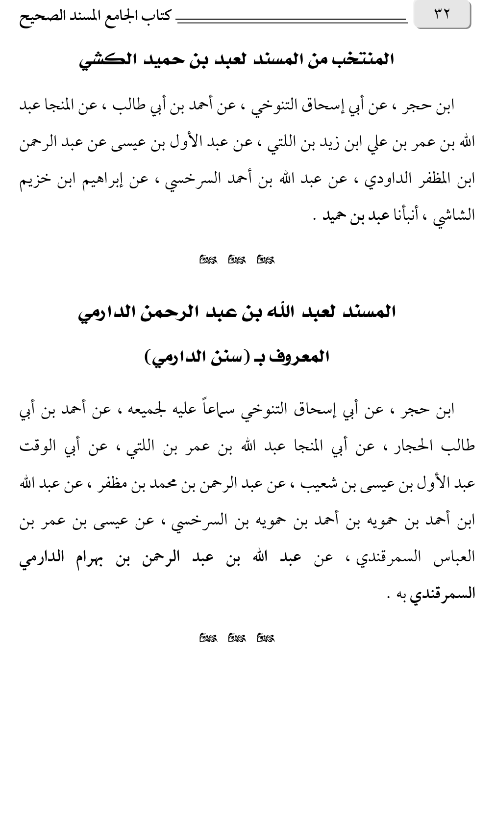 ابن حجر، عن أبي إسحاق التنوخي سماعًا عليه لجميعه، عن أحمد بن أبي طالب الحجار، عن أبي المنجا عبد الله بن عمر بن اللتي، عن أبي الوقت عبد الأول بن عيسى بن شعيب، عن عبد الرحمن بن محمد بن مظفر، عن عبد الله ابن أحمد بن حمويه بن أحمد بن حمويه بن السرخسي، عن عيسى بن عمر بن العباس السمرقندي، عن عبد الله بن عبد الرحمن بن بهرام الدارمي السمرقندي به.