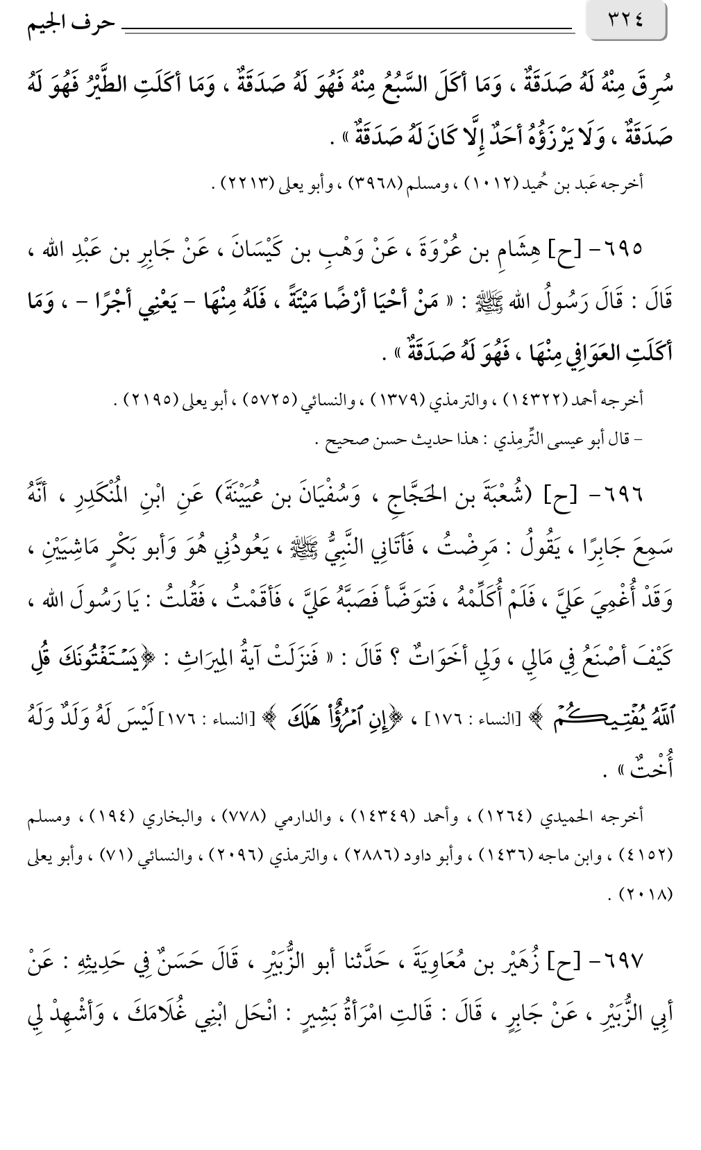 ٦٩٥ - [ح] هِشَامِ بن عُرْوَةَ، عَنْ وَهْبِ بن كَيْسَانَ، عَنْ جَابِرِ بن عَبْدِ الله، قَالَ: قَالَ رَسُولُ الله صلى الله عليه وسلم: «مَنْ أحْيَا أرْضًا مَيْتَةً، فَلَهُ مِنْهَا - يَعْنِي أجْرًا -، وَمَا أكَلَتِ العَوَافِي مِنْهَا، فَهُوَ لَهُ صَدَقَةٌ».
