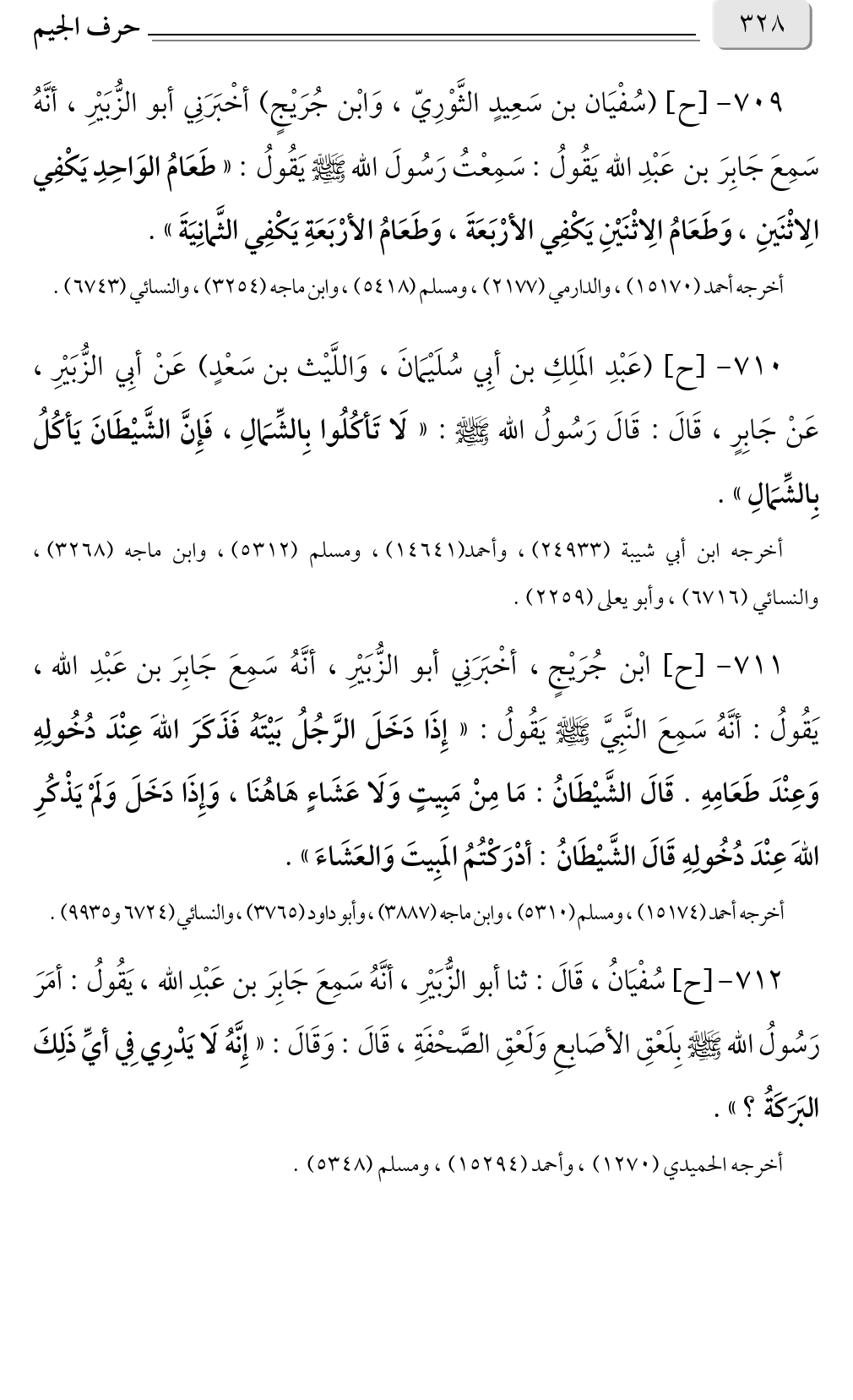٧١٠ - [ح] (عَبْدِ المَلِكِ بن أبِي سُلَيْمَانَ، وَاللَّيْث بن سَعْدٍ) عَنْ أبِي الزُّبَيْرِ، عَنْ جَابِرٍ، قَالَ: قَالَ رَسُولُ الله صلى الله عليه وسلم: «لَا تَأكُلُوا بِالشِّمَالِ، فَإِنَّ الشَّيْطَانَ يَأكُلُ بِالشِّمَالِ».