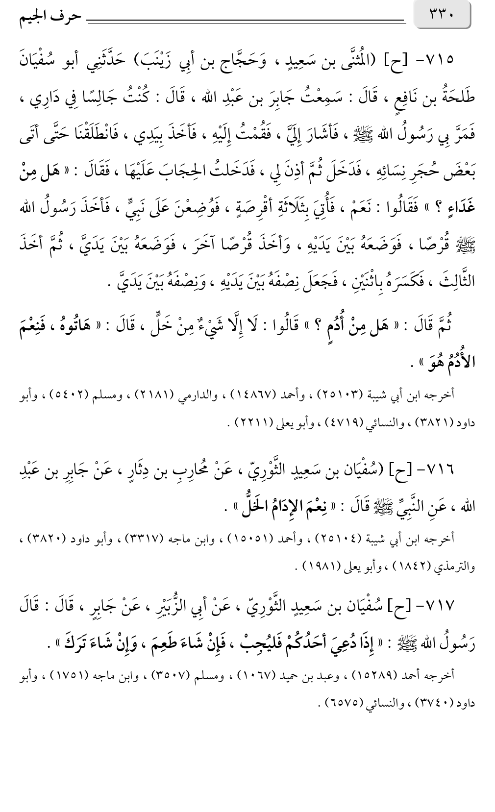 ٧١٦ - [ح] (سُفْيَان بن سَعِيدٍ الثَّوْرِيّ، عَنْ مُحارِبِ بن دِثَارٍ، عَنْ جَابِرِ بن عَبْدِ الله، عَنِ النَّبِيِّ صلى الله عليه وسلم قَالَ: «نِعْمَ الإِدَامُ الخَلُّ».