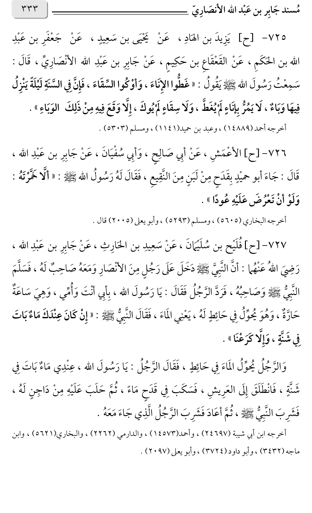 ٧٢٥ - [ح] يَزِيدَ بن الهَادِ، عَنْ يَحْيَى بن سَعِيدٍ، عَنْ جَعْفَرِ بن عَبْدِ الله بن الحَكَمِ، عَنْ القَعْقَاعِ بن حَكِيمٍ، عَنْ جَابِرِ بن عَبْدِ الله الأنْصَارِيِّ، قَالَ: سَمِعْتُ رَسُولَ الله صلى الله عليه وسلم يَقُولُ: «غَطُّوا الإِنَاءَ، وَأوْكُوا السِّقَاءَ، فَإِنَّ فِي السَّنَةِ لَيْلَةً يَنْزِلُ فِيهَا وَبَاءٌ، لَا يَمُرُّ بِإنَاءٍ لَمْ يُغَطَّ، وَلَا سِقَاءٍ لَمْ يُوكَ، إِلَّا وَقَعَ فِيهِ مِنْ ذَلِكَ الوَبَاءِ».