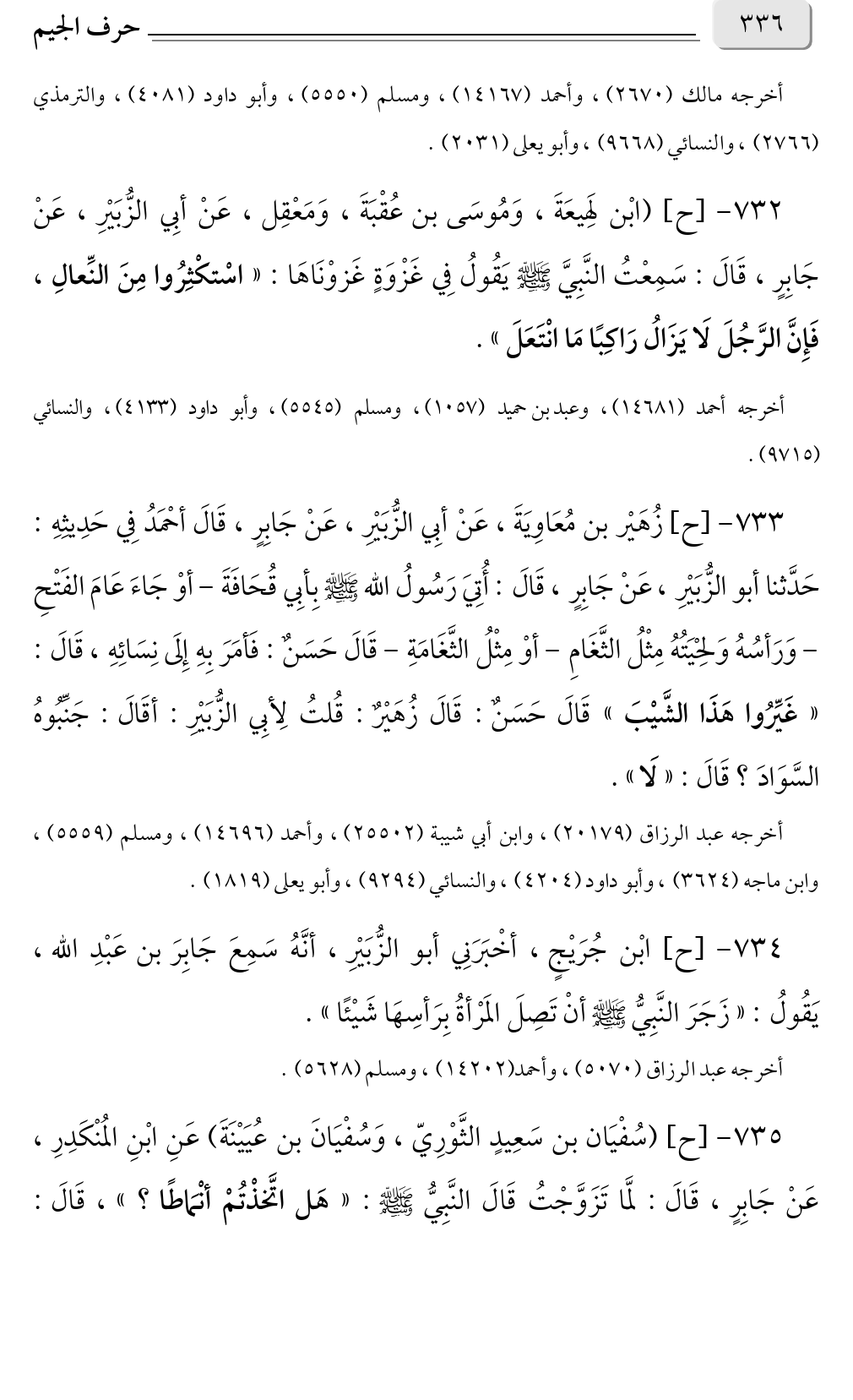 ٧٣٣ - [ح] زُهَيْر بن مُعَاوِيَةَ، عَنْ أبِي الزُّبَيْرِ، عَنْ جَابِرٍ، قَالَ أحْمَدُ فِي حَدِيثِهِ: