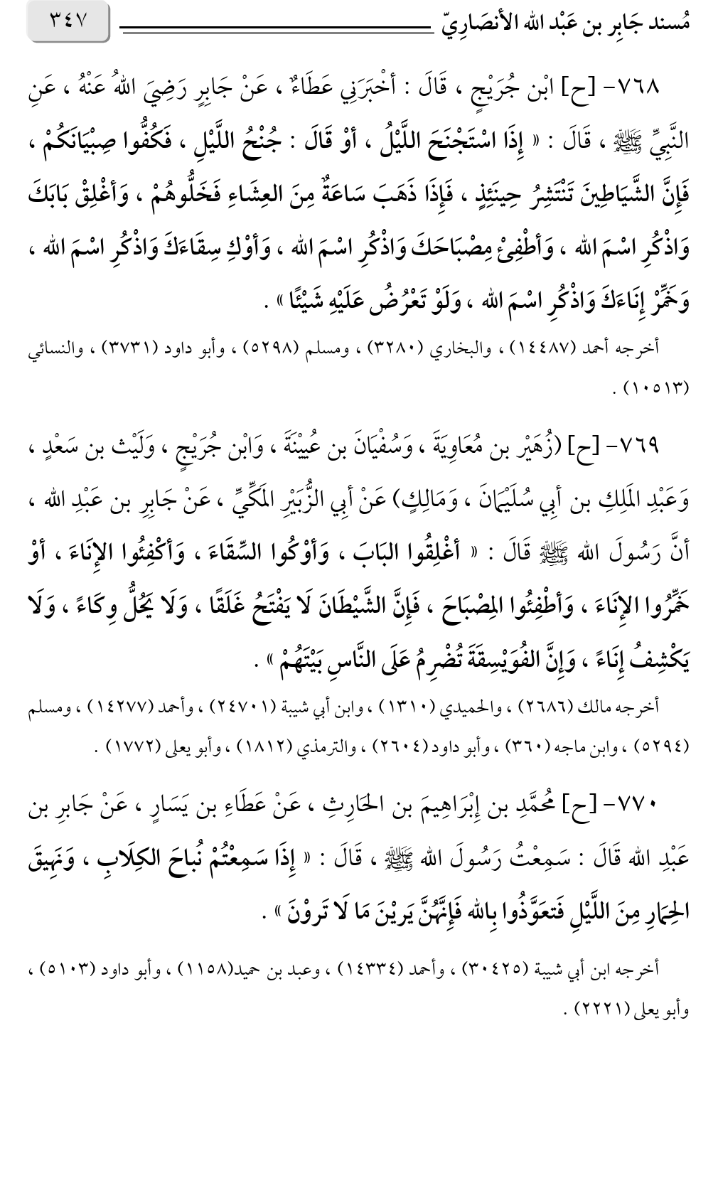 ٧٧٠ - [ح] مُحمَّدِ بن إِبْرَاهِيمَ بن الحَارِثِ، عَنْ عَطَاءِ بن يَسَارٍ، عَنْ جَابرِ بن عَبْدِ الله قَالَ: سَمِعْتُ رَسُولَ الله صلى الله عليه وسلم، قَالَ: «إِذَا سَمِعْتُمْ نُباحَ الكِلَابِ، وَنَهِيقَ الحِمَارِ مِنَ اللَّيْلِ فَتعَوَّذُوا بِالله فَإِنَّهُنَّ يَريْنَ مَا لَا تَروْنَ».