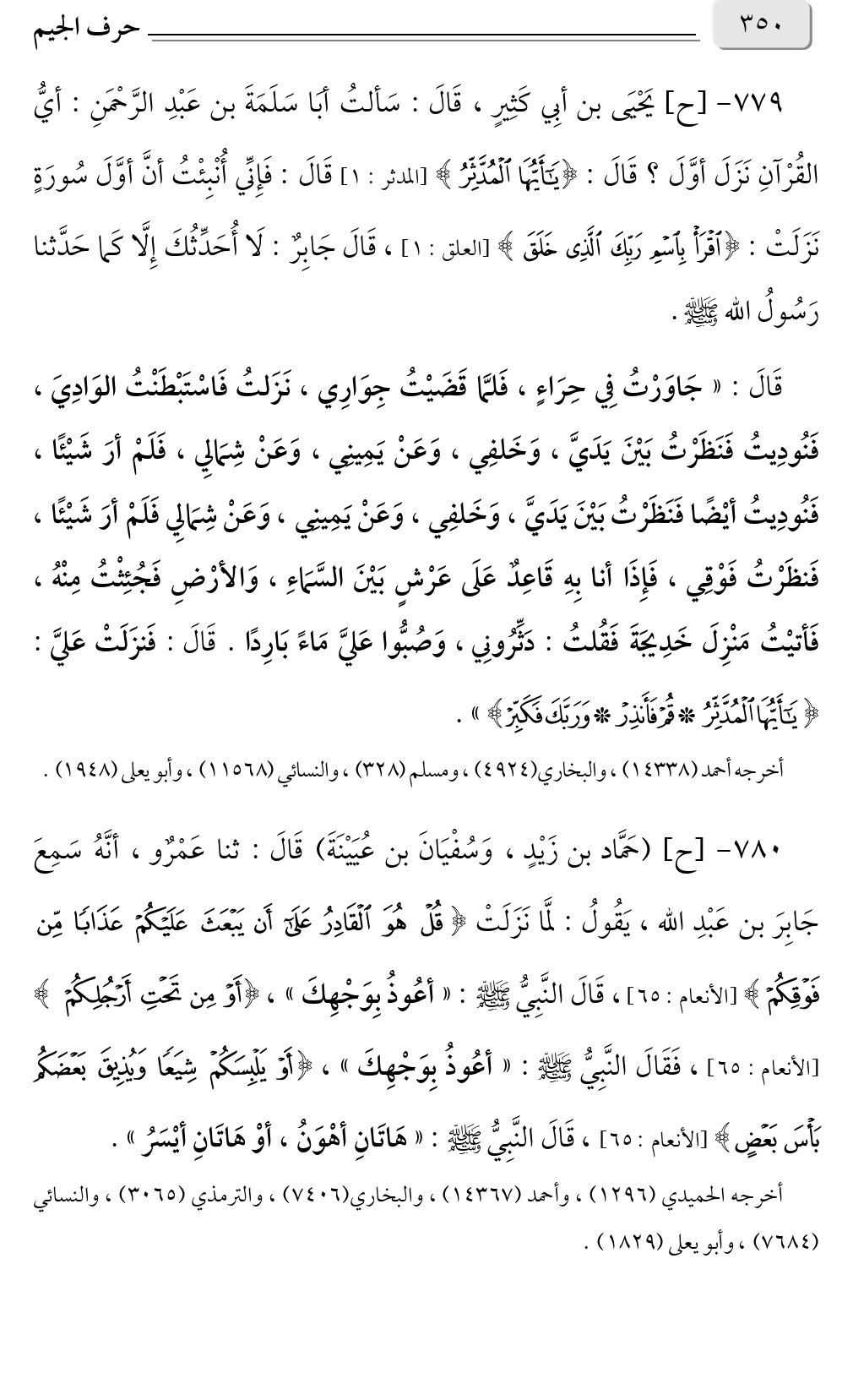 ٧٧٩ - [ح] يَحْيَى بن أبِي كَثِيرٍ، قَالَ: سَألتُ أبَا سَلَمَةَ بن عَبْدِ الرَّحْمَنِ: أيُّ القُرْآنِ نَزَلَ أوَّلَ؟ قَالَ: {يَاأَيُّهَا الْمُدَّثِّرُ} [المدثر: ١] قَالَ: فَإِنِّي أُنْبِئْتُ أنَّ أوَّلَ سُورَةٍ نَزَلَتْ: {اقْرَأْ بِاسْمِ رَبِّكَ الَّذِي خَلَقَ} [العلق: ١]، قَالَ جَابِرٌ: لَا أُحَدِّثُكَ إِلَّا كَما حَدَّثنا رَسُولُ الله صلى الله عليه وسلم.
