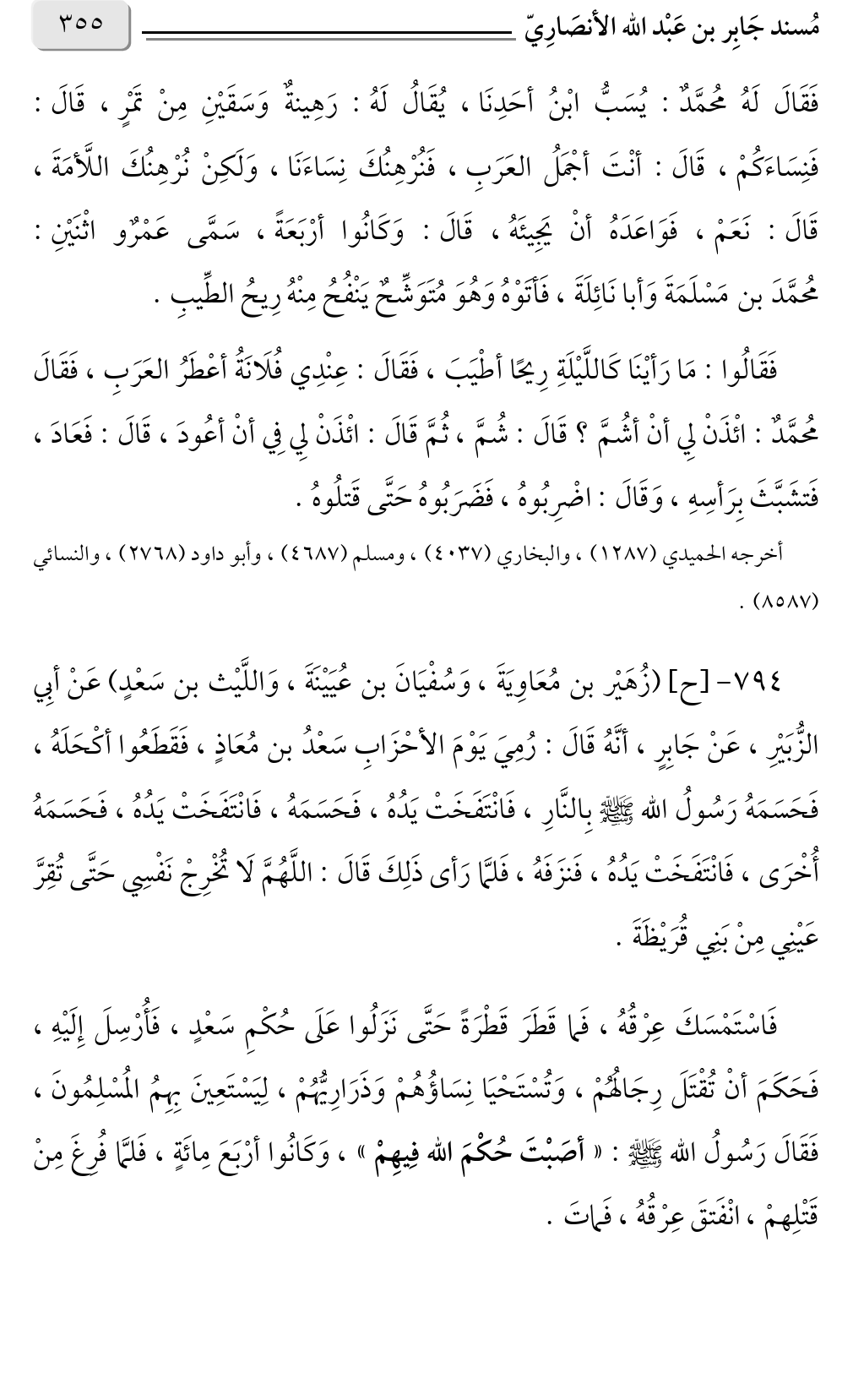 ٧٩٤ - [ح] (زُهَيْر بن مُعَاوِيَةَ، وَسُفْيَانَ بن عُيَيْنَةَ، وَاللَّيْث بن سَعْدٍ) عَنْ أبِي الزُّبَيْرِ، عَنْ جَابِرٍ، أنَّهُ قَالَ: رُمِيَ يَوْمَ الأحْزَابِ سَعْدُ بن مُعَاذٍ، فَقَطَعُوا أكْحَلَهُ، فَحَسَمَهُ رَسُولُ الله صلى الله عليه وسلم بِالنَّارِ، فَانْتَفَخَتْ يَدُهُ، فَحَسَمَهُ، فَانْتَفَخَتْ يَدُهُ، فَحَسَمَهُ أُخْرَى، فَانْتَفَخَتْ يَدُهُ، فَنزَفَهُ، فَلمَّا رَأى ذَلِكَ قَالَ: اللَّهُمَّ لَا تُخْرِجْ نَفْسِي حَتَّى تُقِرَّ عَيْنِي مِنْ بَنِي قُرَيْظَةَ.