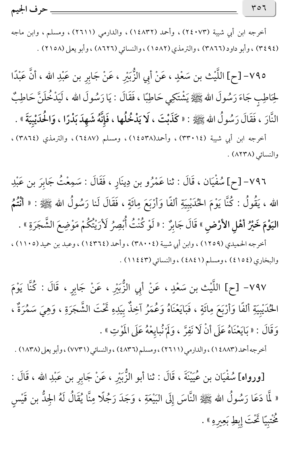 ٧٩٥ - [ح] اللَّيْث بن سَعْدٍ، عَنْ أبِي الزُّبَيْرِ، عَنْ جَابِرِ بن عَبْدِ الله، أنَّ عَبْدًا لحَاطِبٍ جَاءَ رَسُولَ الله صلى الله عليه وسلم يَشْتَكِي حَاطِبًا، فَقَالَ: يَا رَسُولَ الله، لَيَدْخُلَنَّ حَاطِبٌ النَّارَ، فَقَالَ رَسُولُ الله صلى الله عليه وسلم: «كَذَبْتَ، لَا يَدْخُلُها، فَإِنَّهُ شَهِدَ بَدْرًا، وَالحُدَيْبِيَةَ».