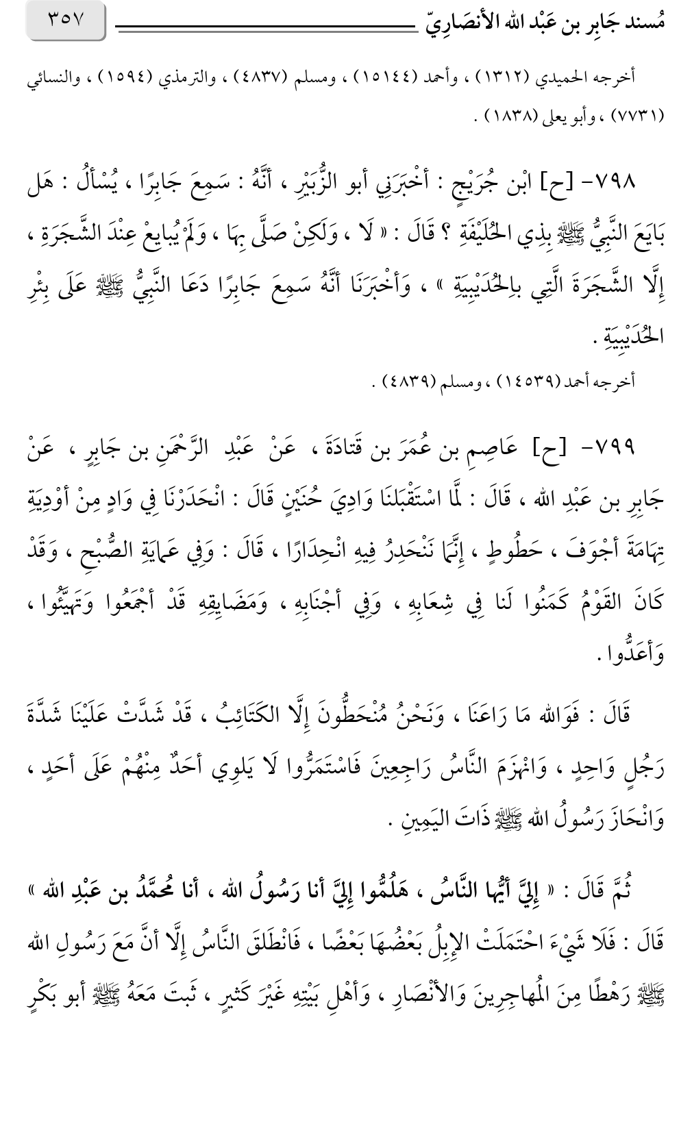 ٧٩٨ - [ح] ابْن جُرَيْجٍ: أخْبَرَنِي أبو الزُّبَيْرِ، أنَّهُ: سَمِعَ جَابِرًا، يُسْألُ: هَل بَايَعَ النَّبِيُّ صلى الله عليه وسلم بِذِي الحُلَيْفَةِ؟ قَالَ: «لَا، وَلَكِنْ صَلَّى بِهَا، وَلَمْ يُبايِعْ عِنْدَ الشَّجَرَةِ، إِلَّا الشَّجَرَةَ الَّتِي باِلحُدَيْبِيَةِ» وَأخْبَرَنَا أنَّهُ سَمِعَ جَابِرًا دَعَا النَّبِيُّ صلى الله عليه وسلم عَلَى بِئْرِ، الحُدَيْبِيَةِ.