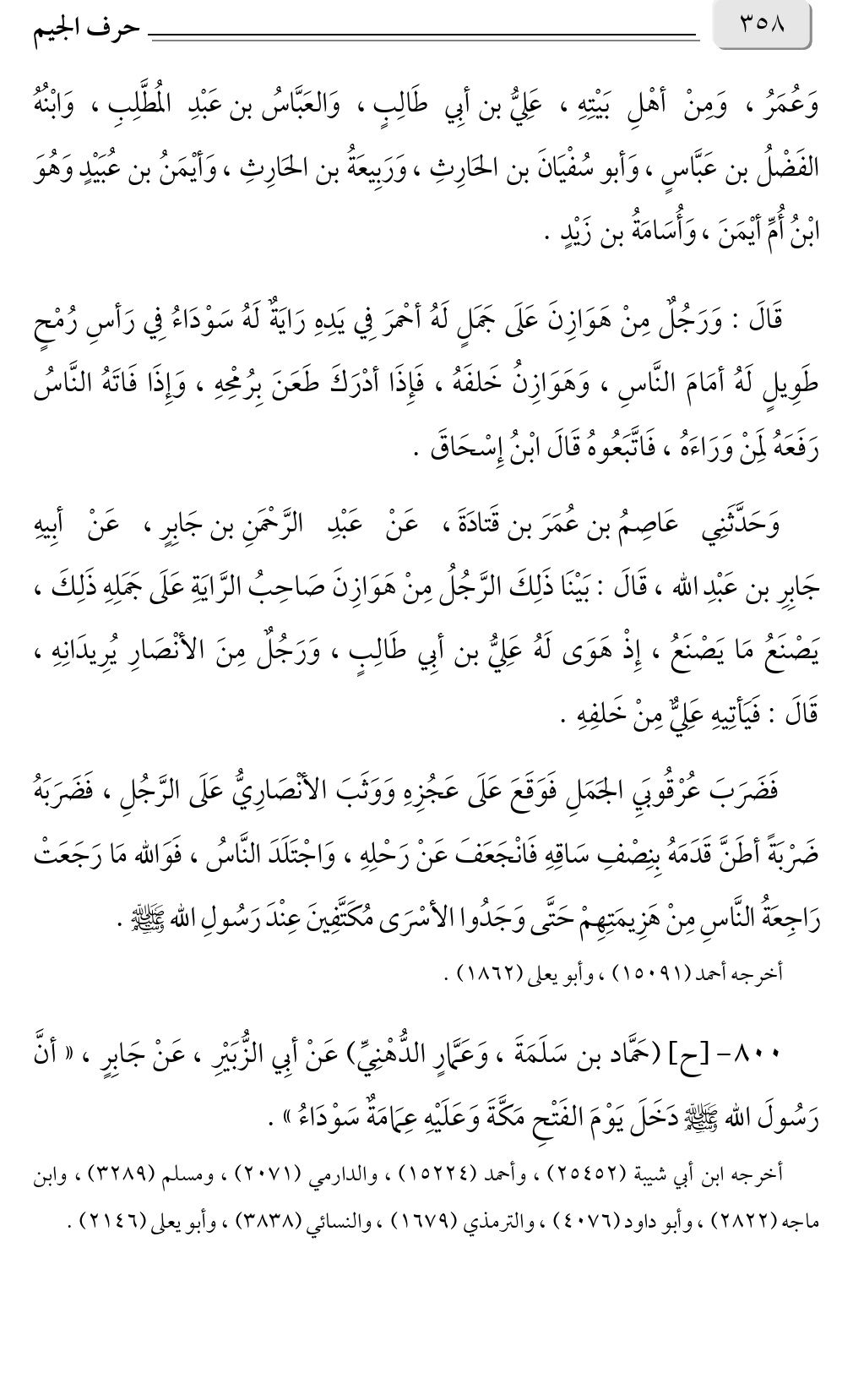٨٠٠ - [ح] (حَمَّاد بن سَلَمَةَ، وَعَمَّارٍ الدُّهْنِيِّ) عَنْ أبِي الزُّبَيْرِ، عَنْ جَابِرٍ، «أنَّ رَسُولَ الله صلى الله عليه وسلم دَخَلَ يَوْمَ الفَتْحِ مَكَّةَ وَعَلَيْهِ عِمَامَةٌ سَوْدَاءُ».