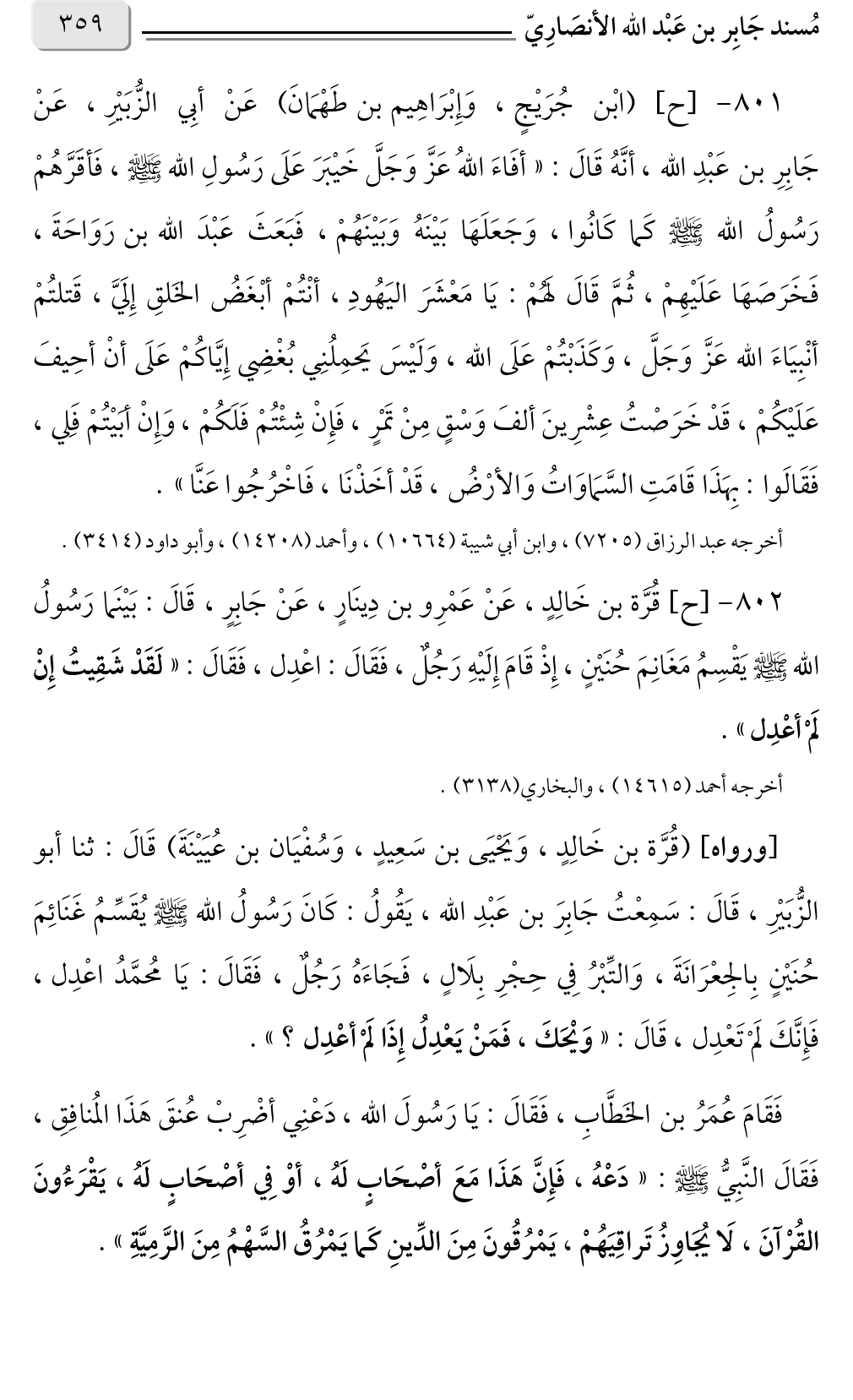 ٨٠١ - [ح] (ابْن جُرَيْجٍ، وَإِبْرَاهِيم بن طَهْمَانَ) عَنْ أبِي الزُّبَيْرِ، عَنْ جَابِرِ بن عَبْدِ الله، أنَّهُ قَالَ: «أفَاءَ اللهُ عَزَّ وَجَلَّ خَيْبَرَ عَلَى رَسُولِ الله صلى الله عليه وسلم، فَأقَرَّهُمْ رَسُولُ الله صلى الله عليه وسلم كَما كَانُوا، وَجَعَلَهَا بَيْنَهُ وَبَيْنَهُمْ، فَبَعَثَ عَبْدَ الله بن رَوَاحَةَ، فَخَرَصَهَا عَلَيْهِمْ، ثُمَّ قَالَ لَهُمْ: يَا مَعْشَرَ اليَهُودِ، أنْتُمْ أبْغَضُ الخَلقِ إِلَيَّ، قَتلتُمْ أنْبِيَاءَ الله عَزَّ وَجَلَّ، وَكَذَبْتُمْ عَلَى الله، وَلَيْسَ يَحمِلُنِي بُغْضِي إِيَّاكُمْ عَلَى أنْ أحِيفَ عَلَيْكُمْ، قَدْ خَرَصْتُ عِشْرِينَ ألفَ وَسْقٍ مِنْ تَمْرٍ، فَإِنْ شِئْتُمْ فَلَكُمْ، وَإِنْ أبَيْتُمْ فَلي، فَقَالَوا: بِهَذَا قَامَتِ السَّمَاوَاتُ وَالأرْضُ، قَدْ أخَذْنَا، فَاخْرُجُوا عَنَّا».