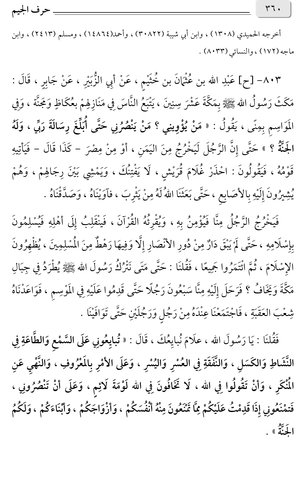 ٨٠٣ - [ح] عَبْدِ الله بن عُثْمَانَ بن خُثَيْمٍ، عَنْ أبِي الزُّبَيْرِ، عَنْ جَابِرٍ، قَالَ: مَكَثَ رَسُولُ الله صلى الله عليه وسلم بِمَكَّةَ عَشْرَ سِنِينَ، يَتْبَعُ النَّاسَ فِي مَنَازِلهِمْ بعُكَاظٍ وَمَجنَّة، وَفِي المَوَاسِمِ بِمِنًى، يَقُولُ: «مَنْ يُؤْوِينِي؟ مَنْ يَنْصُرُنِي حَتَّى أُبَلِّغَ رِسَالَةَ رَبِّي، وَلَهُ الجَنَّةُ؟ » حَتَّى إِنَّ الرَّجُلَ لَيَخْرُجُ مِنَ اليَمَنِ، أوْ مِنْ مِصْرَ - كَذَا قَالَ - فَيَأتِيهِ قَوْمُهُ، فَيَقُولُونَ: احْذَرْ غُلَامَ قُرَيْشٍ، لَا يَفْتِنُكَ، وَيَمْشِي بَيْنَ رِجَالهِمْ، وَهُمْ يُشِيرُونَ إِلَيْهِ بِالأصَابِعِ، حَتَّى بَعَثَنَا اللهُ لَهُ مِنْ يَثْرِبَ، فآوَيْنَاهُ، وَصَدَّقْنَاهُ.