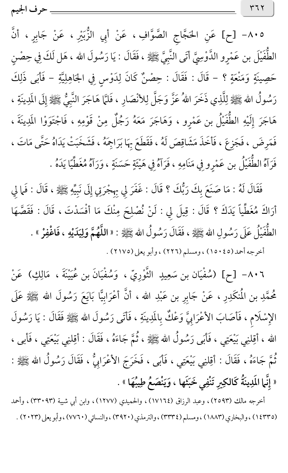 ٨٠٥ - [ح] عَنِ الحَجَّاجِ الصَّوَّافِ، عَنْ أبِي الزُّبَيْرِ، عَنْ جَابِرٍ، أنَّ الطُّفَيْلَ بن عَمْرٍو الدَّوْسِيَّ أتَى النَّبِيَّ صلى الله عليه وسلم، فَقَالَ: يَا رَسُولَ الله، هَل لَكَ فِي حِصْنٍ حَصِينَةٍ وَمَنْعَةٍ؟ - قَالَ: فَقَالَ: حِصْنٌ كَانَ لِدَوْسٍ فِي الجَاهِلِيَّةِ - فَأبَى ذَلِكَ رَسُولُ الله صلى الله عليه وسلم لِلَّذِي ذَخَرَ اللهُ عَزَّ وَجَلَّ لِلأنْصَارِ، فَلمَّا هَاجَرَ النَّبِيُّ صلى الله عليه وسلم إِلَى المَدِينَةِ، هَاجَرَ إِلَيْهِ الطُّفَيْلُ بن عَمْرٍو، وَهَاجَرَ مَعَهُ رَجُلٌ مِنْ قَوْمِهِ، فَاجْتَوَوْا المَدِينَةَ، فَمَرِضَ، فَجَزِعَ، فَأخَذَ مَشَاقِصَ لَهُ، فَقَطَعَ بِهَا بَرَاجِمَهُ، فَشَخَبَتْ يَدَاهُ حَتَّى مَاتَ، فَرَآهُ الطُّفَيْلُ بن عَمْرٍو فِي مَنَامِهِ، فَرَآهُ فِي هَيْئَةٍ حَسَنَةٍ، وَرَآهُ مُغَطِّيًا يَدَهُ.
