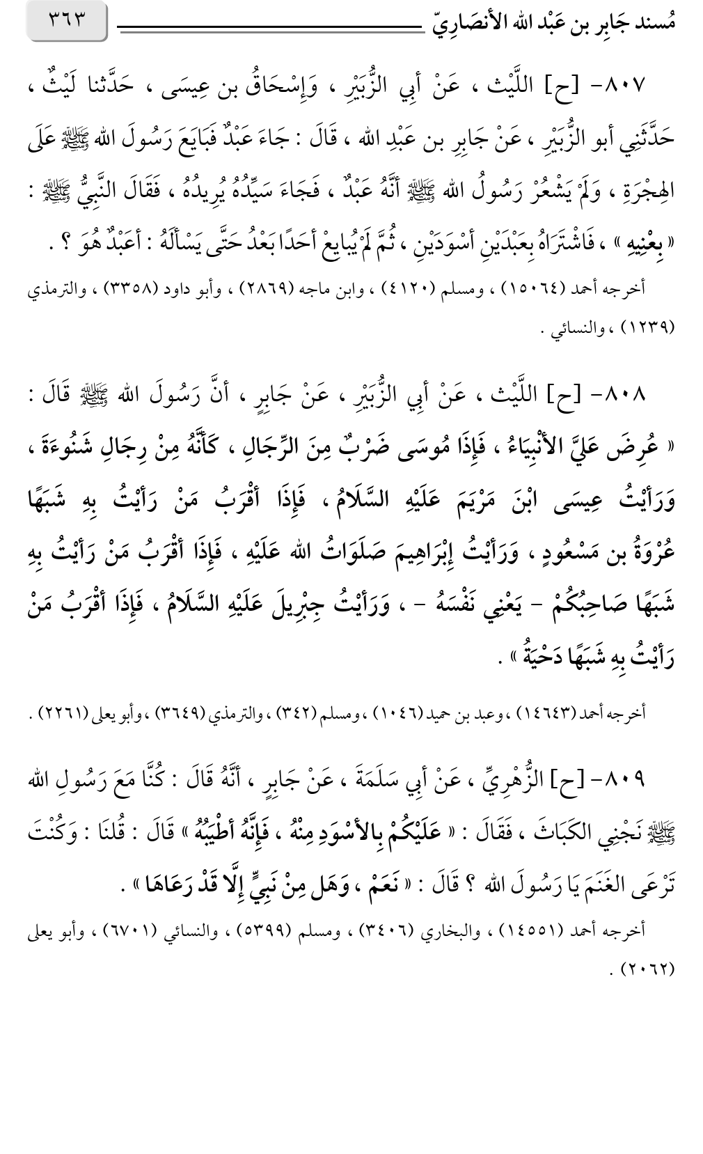 ٨٠٧ - [ح] اللَّيْث، عَنْ أبِي الزُّبَيْرِ، وَإِسْحَاقُ بن عِيسَى، حَدَّثنا لَيْثٌ، حَدَّثَنِي أبو الزُّبَيْرِ، عَنْ جَابِرِ بن عَبْدِ الله، قَالَ: جَاءَ عَبْدٌ فَبَايَعَ رَسُولَ الله صلى الله عليه وسلم عَلَى الهِجْرَةِ، وَلَمْ يَشْعُرْ رَسُولُ الله صلى الله عليه وسلم أنَّهُ عَبْدٌ، فَجَاءَ سَيِّدُهُ يُرِيدُهُ، فَقَالَ النَّبِيُّ صلى الله عليه وسلم: «بِعْنِيهِ»، فَاشْتَرَاهُ بِعَبْدَيْنِ أسْوَدَيْنِ، ثُمَّ لَمْ يُبايِعْ أحَدًا بَعْدُ حَتَّى يَسْألَهُ: أعَبْدٌ هُوَ؟ .