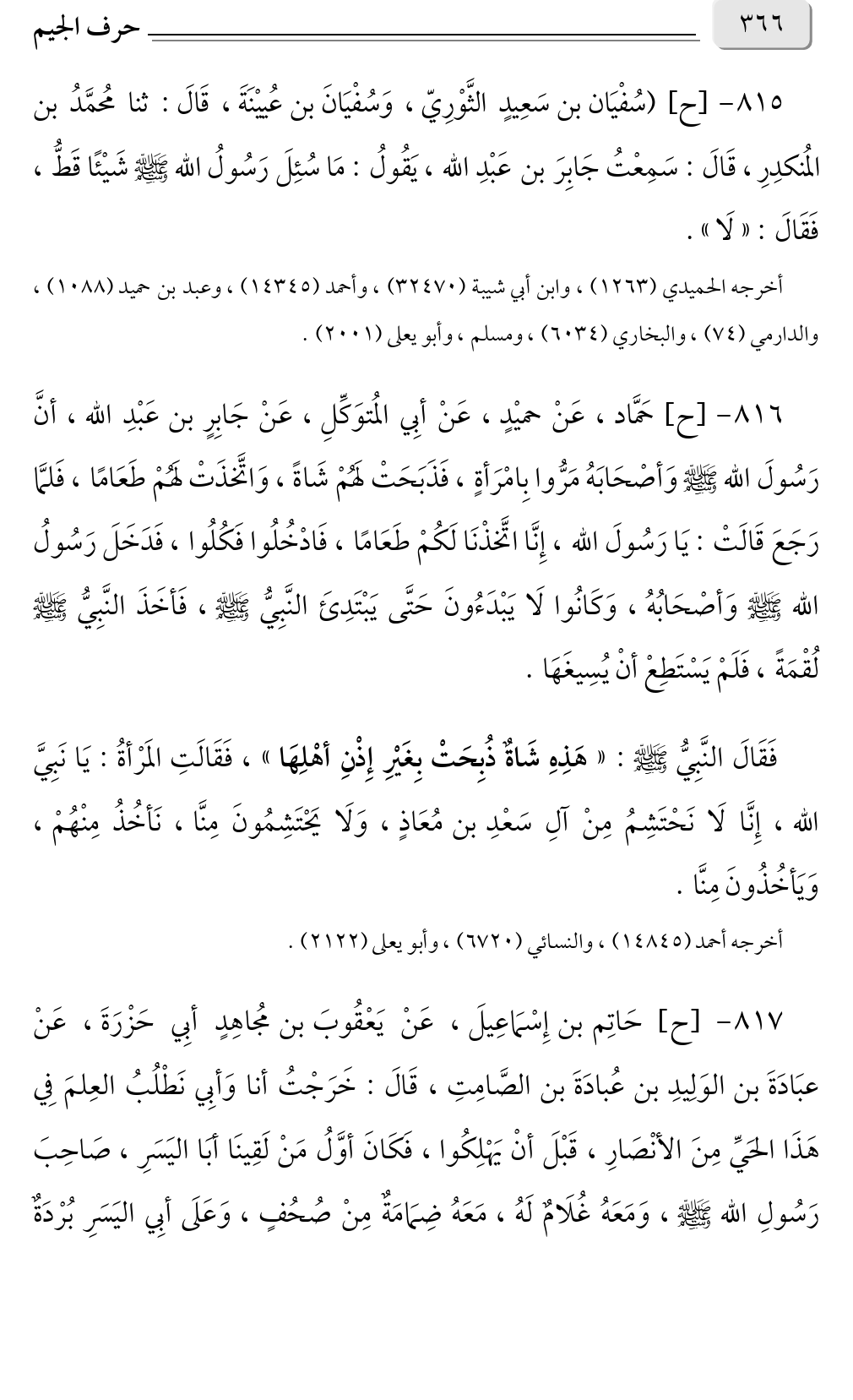٨١٥ - [ح] (سُفْيَان بن سَعِيدٍ الثَّوْرِيّ، وَسُفْيَانَ بن عُييْنَةَ، قَالَ: ثنا مُحمَّدُ بن المُنكدِرِ، قَالَ: سَمِعْتُ جَابِرَ بن عَبْدِ الله، يَقُولُ: مَا سُئِلَ رَسُولُ الله صلى الله عليه وسلم شَيْئًا قَطُّ، فَقَالَ: «لَا».