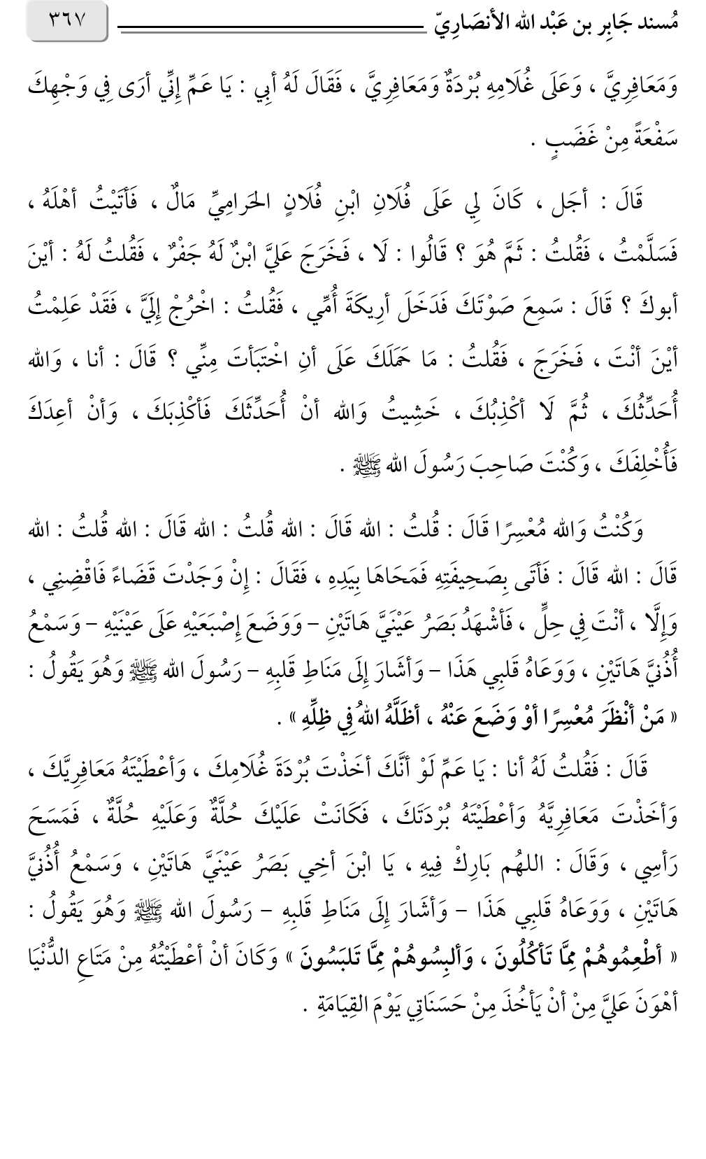 قَالَ: فَقُلتُ لَهُ أنا: يَا عَمِّ لَوْ أنَّكَ أخَذْتَ بُرْدَةَ غُلَامِكَ، وَأعْطَيْتَهُ مَعَافِرِيَّكَ، وَأخَذْتَ مَعَافِرِيَّهُ وَأعْطَيْتَهُ بُرْدَتَكَ، فَكَانَتْ عَلَيْكَ حُلَّةٌ وَعَلَيْهِ حُلَّةٌ، فَمَسَحَ رَأسِي، وَقَالَ: اللهُم بَارِكْ فِيهِ، يَا ابْنَ أخِي بَصَرُ عَيْنَيَّ هَاتَيْنِ، وَسَمْعُ أُذُنيَّ هَاتَيْنِ، وَوَعَاهُ قَلبِي هَذَا - وَأشَارَ إِلَى مَنَاطِ قَلبِهِ - رَسُولَ الله صلى الله عليه وسلم وَهُوَ يَقُولُ: «أطْعِمُوهُمْ مِمَّا تَأكُلُونَ، وَألبِسُوهُمْ مِمَّا تَلبَسُونَ» وَكَانَ أنْ أعْطَيْتُهُ مِنْ مَتَاعِ الدُّنْيَا أهْوَنَ عَليَّ مِنْ أنْ يَأخُذَ مِنْ حَسَنَاتِي يَوْمَ القِيَامَةِ.