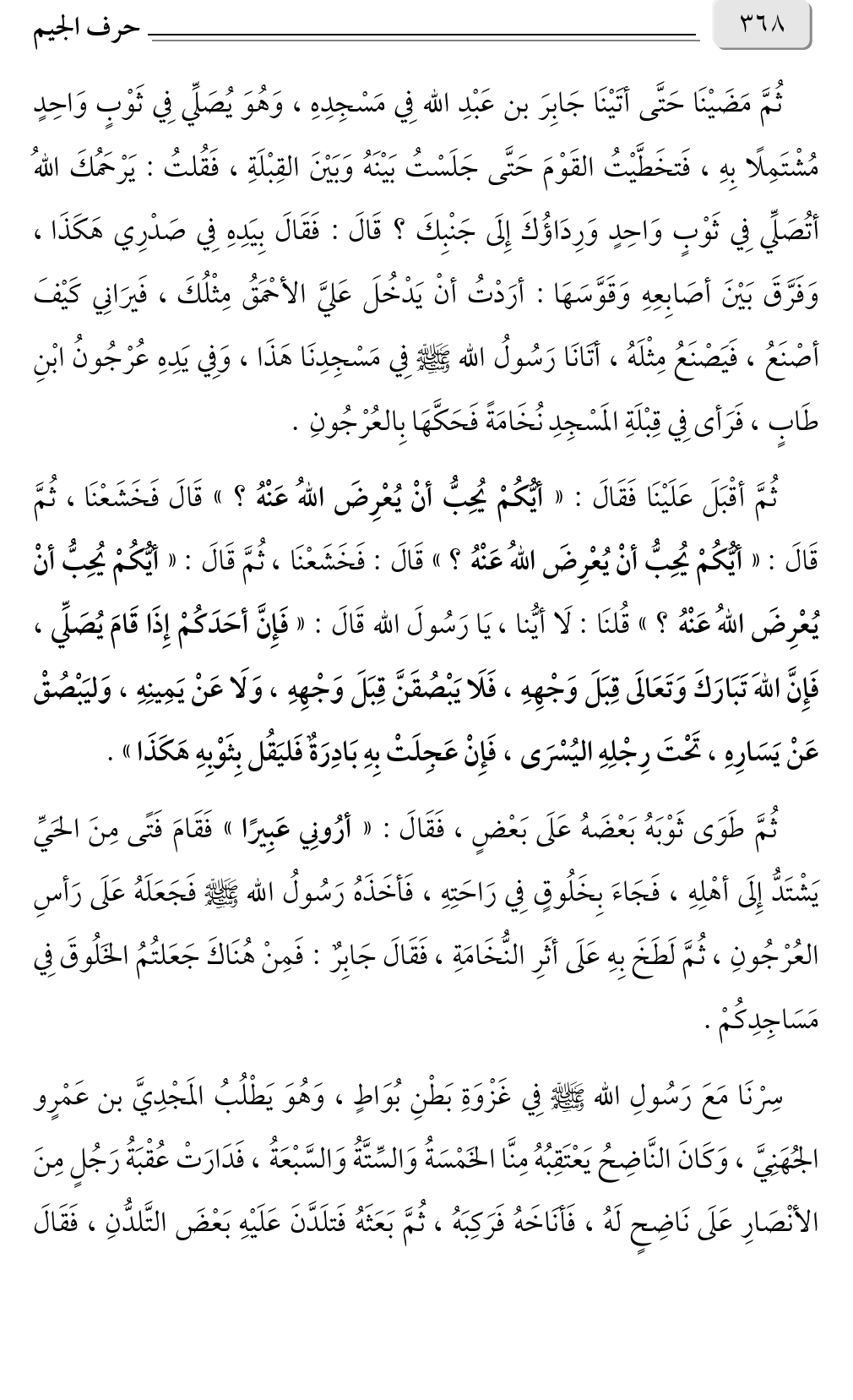ثُمَّ مَضَيْنَا حَتَّى أتَيْنَا جَابِرَ بن عَبْدِ الله فِي مَسْجِدِهِ، وَهُوَ يُصَلِّي فِي ثَوْبٍ وَاحِدٍ مُشْتَمِلًا بِهِ، فَتخَطَّيْتُ القَوْمَ حَتَّى جَلَسْتُ بَيْنَهُ وَبَيْنَ القِبْلَةِ، فَقُلتُ: يَرْحَمُكَ اللهُ أتُصَلِّي فِي ثَوْبٍ وَاحِدٍ وَرِدَاؤُكَ إِلَى جَنْبِكَ؟ قَالَ: فَقَالَ بِيَدِهِ فِي صَدْرِي هَكَذَا، وَفَرَّقَ بَيْنَ أصَابِعِهِ وَقَوَّسَهَا: أرَدْتُ أنْ يَدْخُلَ عَليَّ الأحْمَقُ مِثْلُكَ، فَيرَانِي كَيْفَ أصْنَعُ، فَيَصْنَعُ مِثْلَهُ، أتَانَا رَسُولُ الله صلى الله عليه وسلم فِي مَسْجِدِنَا هَذَا، وَفِي يَدِهِ عُرْجُونُ ابْنِ طَابٍ، فَرَأى فِي قِبْلَةِ المَسْجِدِ نُخَامَةً فَحَكَّهَا بِالعُرْجُونِ.