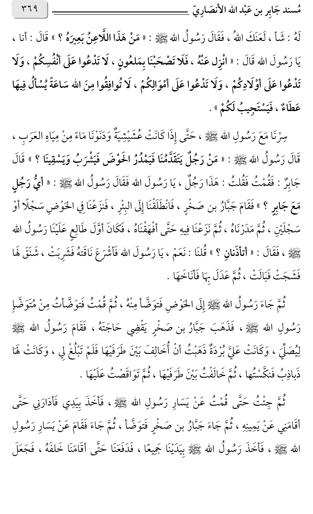 سِرْنَا مَعَ رَسُولِ الله صلى الله عليه وسلم، حَتَّى إِذَا كَانَتْ عُشَيْشِيَةٌ وَدَنَوْنَا مَاءً مِنْ مِيَاهِ العَرَبِ، قَالَ رَسُولُ الله صلى الله عليه وسلم: «مَنْ رَجُلٌ يَتَقَدَّمُنَا فَيَمْدُرُ الحَوْضَ فَيَشْرَبُ وَيَسْقِينَا؟ » قَالَ جَابِرٌ: فَقُمْتُ فَقُلتُ: هَذَا رَجُلٌ، يَا رَسُولَ الله فَقَالَ رَسُولُ الله صلى الله عليه وسلم: «أيُّ رَجُلٍ مَعَ جَابِرٍ؟ » فَقَامَ جَبَّارُ بن صَخْرٍ، فَانْطَلَقْنَا إِلَى البِئْرِ، فَنزَعْنَا فِي الحَوْضِ سَجْلًا أوْ سَجْلَيْنِ، ثُمَّ مَدَرْنَاهُ، ثُمَّ نَزَعْنَا فِيهِ حَتَّى أفْهَقْنَاهُ، فَكَانَ أوَّلَ طَالِعٍ عَلَيْنَا رَسُولُ الله صلى الله عليه وسلم، فَقَالَ: «أتأذَنانِ؟ » قُلنَا: نَعَمْ، يَا رَسُولَ الله فَأشْرَعَ نَاقَتهُ فَشَرِبَتْ، شَنَقَ لَها فَشَجَتْ فَبَالَتْ، ثُمَّ عَدَلَ بِهَا فَأنَاخَهَا.