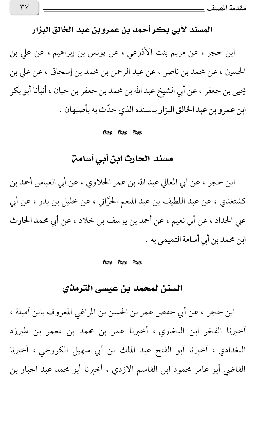ابن حجر، عن مريم بنت الأذرعي، عن يونس بن إبراهيم، عن علي بن الحسين، عن محمد بن ناصر، عن عبد الرحمن بن محمد بن إسحاق، عن علي بن يحيى بن جعفر، عن أبي الشيخ عبد الله بن محمد بن جعفر بن حبان، أنبأنا أبو بكر ابن عمرو بن عبد الخالق البزار بمسنده الذي حدّث به بأصبهان.