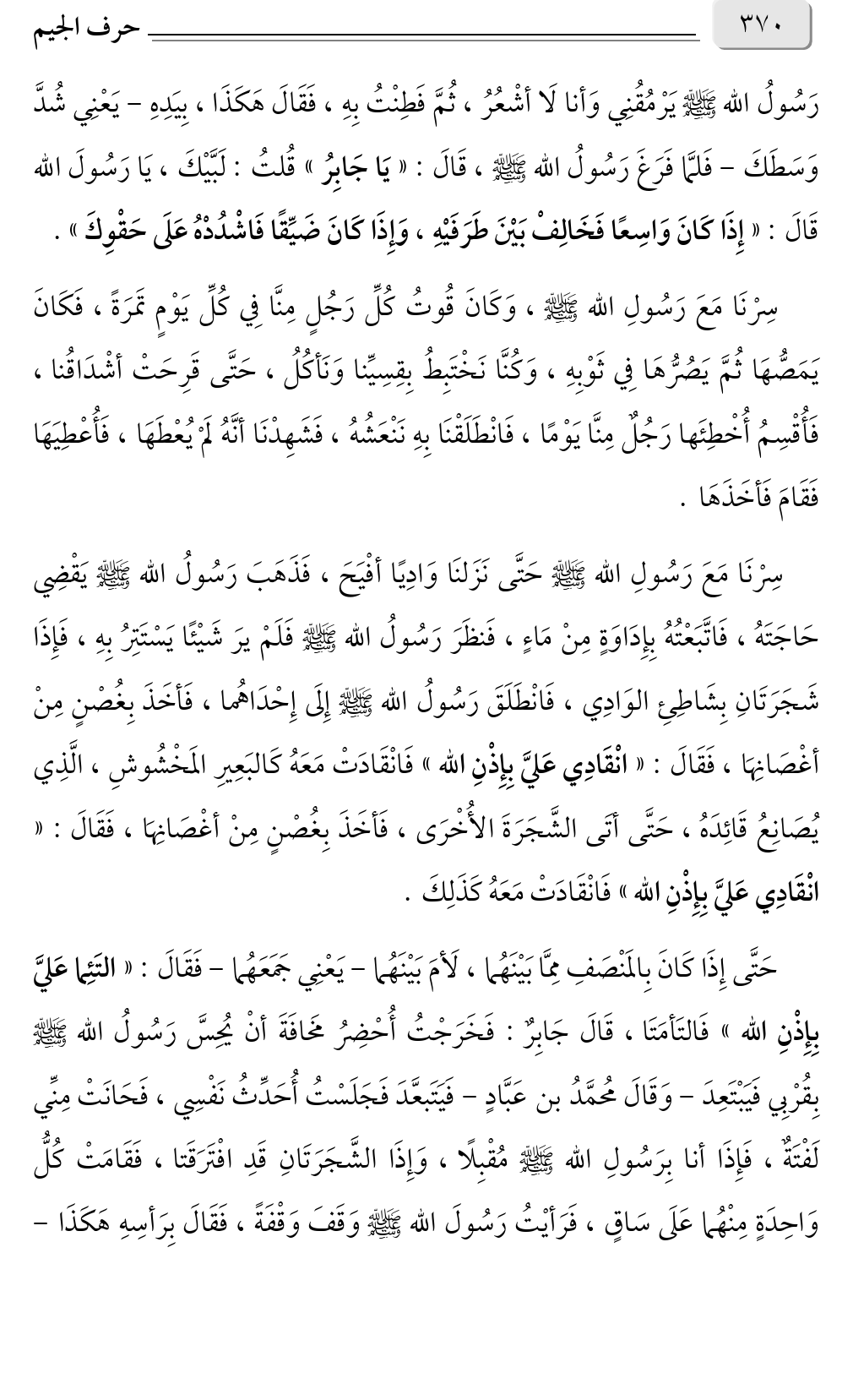 سِرْنَا مَعَ رَسُولِ الله صلى الله عليه وسلم حَتَّى نَزَلنَا وَادِيًا أفْيَحَ، فَذَهَبَ رَسُولُ الله صلى الله عليه وسلم يَقْضِي حَاجَتَهُ، فَاتَّبَعْتُهُ بِإِدَاوَةٍ مِنْ مَاءٍ، فَنظَرَ رَسُولُ الله صلى الله عليه وسلم فَلَمْ يرَ شَيْئًا يَسْتَتِرُ بِهِ، فَإِذَا شَجَرَتَانِ بِشَاطِئِ الوَادِي، فَانْطَلَقَ رَسُولُ الله صلى الله عليه وسلم إِلَى إِحْدَاهُما، فَأخَذَ بِغُصْنٍ مِنْ أغْصَانِهَا، فَقَالَ: «انْقَادِي عَليَّ بِإِذْنِ الله» فَانْقَادَتْ مَعَهُ كَالبَعِيرِ المَخْشُوشِ، الَّذِي يُصَانِعُ قَائِدَهُ، حَتَّى أتَى الشَّجَرَةَ الأُخْرَى، فَأخَذَ بِغُصْنٍ مِنْ أغْصَانِهَا، فَقَالَ: «انْقَادِي عَليَّ بِإِذْنِ الله» فَانْقَادَتْ مَعَهُ كَذَلِكَ.