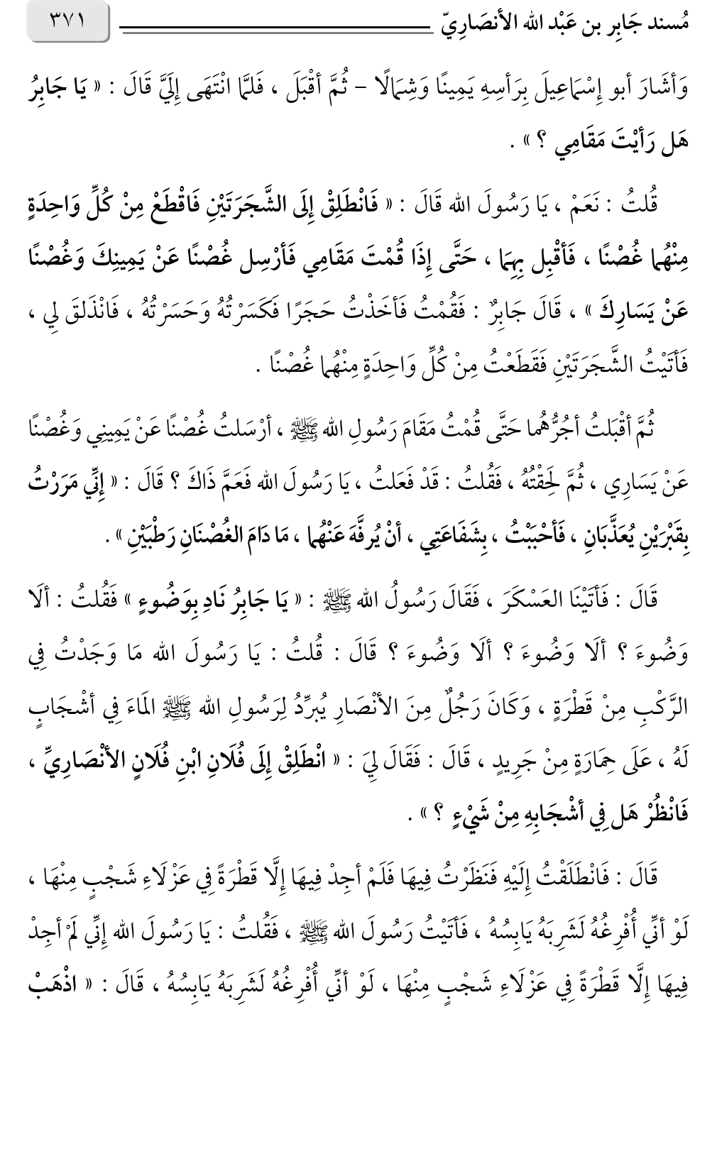 قُلتُ: نَعَمْ، يَا رَسُولَ الله قَالَ: «فَانْطَلِقْ إِلَى الشَّجَرَتَيْنِ فَاقْطَعْ مِنْ كُلِّ وَاحِدَةٍ مِنْهُما غُصْنًا، فَأقْبِل بِهِمَا، حَتَّى إِذَا قُمْتَ مَقَامِي فَأرْسِل غُصْنًا عَنْ يَمِينِكَ وَغُصْنًا عَنْ يَسَارِكَ» قَالَ جَابِرٌ: فَقُمْتُ فَأخَذْتُ حَجَرًا فَكَسَرْتُهُ وَحَسَرْتُهُ، فَانْذَلقَ لِي، ، فَأتَيْتُ الشَّجَرَتَيْنِ فَقَطَعْتُ مِنْ كُلِّ وَاحِدَةٍ مِنْهُما غُصْنًا.