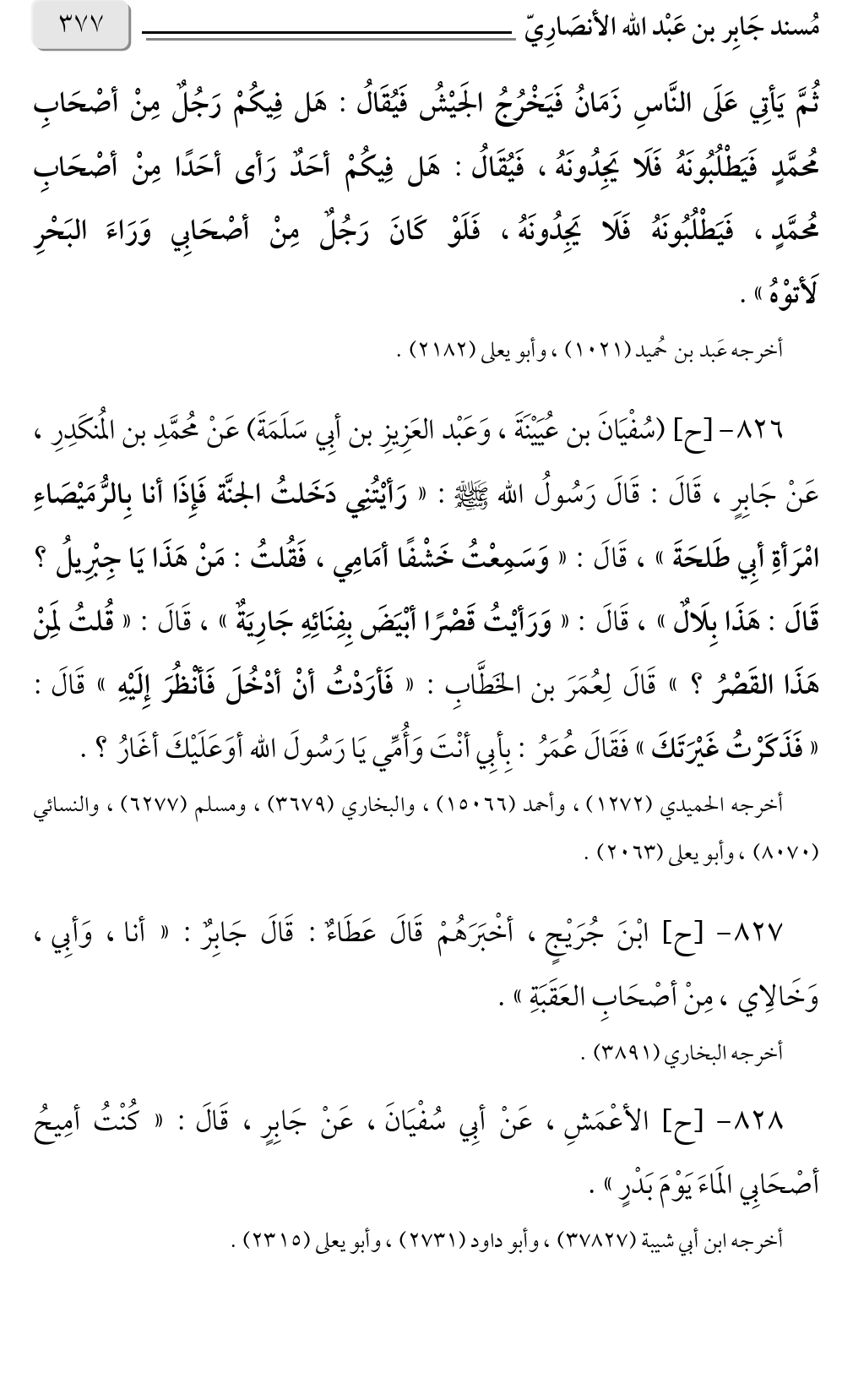 ٨٢٧ - [ح] ابْنَ جُرَيْجٍ، أخْبَرَهُمْ قَالَ عَطَاءٌ: قَالَ جَابِرٌ: «أنا، وَأبِي، وَخَالِاي، مِنْ أصْحَابِ العَقَبَةِ». أخرجه البخاري (٣٨٩١).