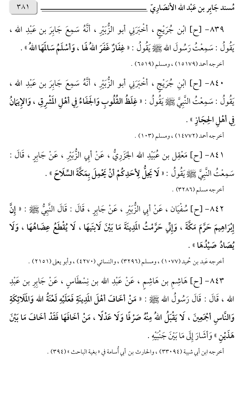 ٨٤١ - [ح] مَعْقِل بن عُبَيْدِ الله الجَزَرِيُّ، عَنْ أبِي الزُّبَيْرِ، عَنْ جَابِرٍ، قَالَ: سَمِعْتُ النَّبِيَّ صلى الله عليه وسلم يَقُولُ: «لَا يَحِلُّ لِأحَدِكُمْ أنْ يَحْمِلَ بِمَكَّةَ السِّلَاحَ».